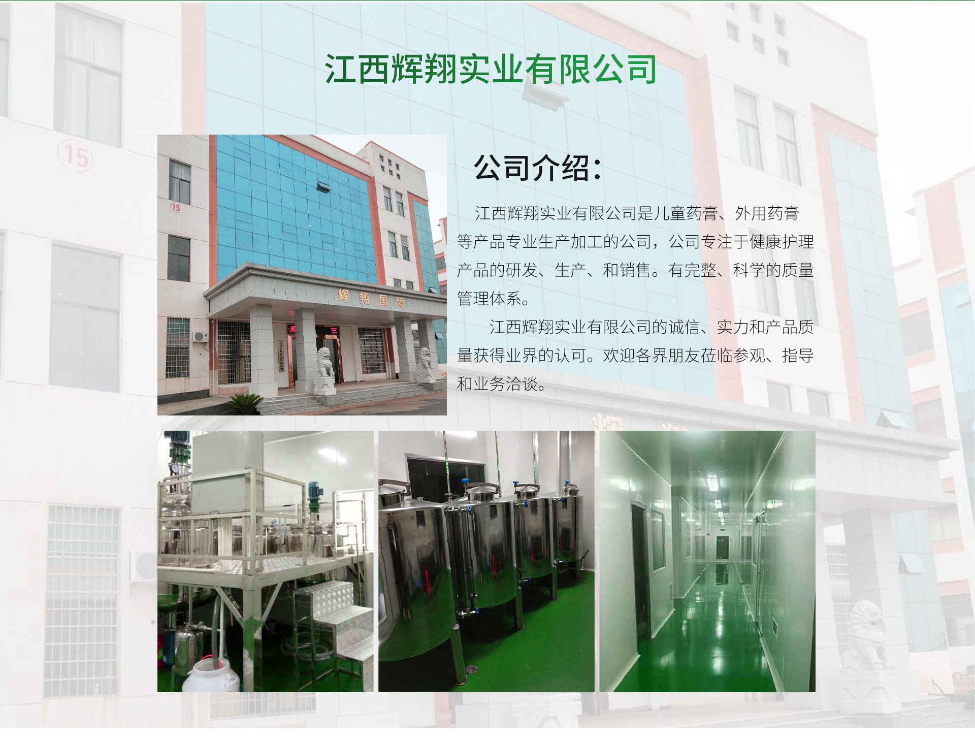 江西輝翔實業有限公司兒童藥膏、外用藥膏等產品專業生產加工的公司,擁有完整、科學的質量管理體系。 江西輝翔實業有限公司的兒童藥膏、外用藥膏誠信、實力和產品質量獲得業界的認可。 歡迎各界朋友蒞臨參觀、指導和業務洽談。
