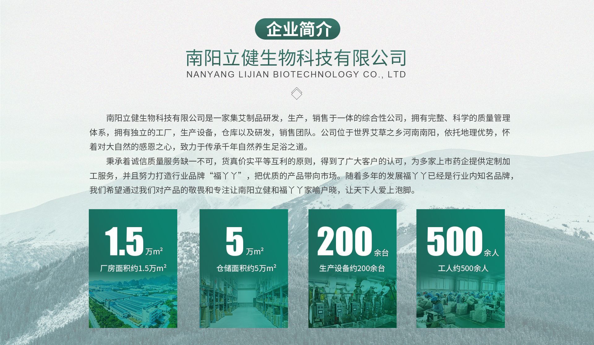 南陽立健生物科技有限公司。創立于2015年,主要針對南陽特產——艾制品進行系列研發、生產、倉儲、銷售于一體的綜合性公司,擁有完整、科學的質量管理體系,擁有獨立的工廠,自主研發的全自動生產設備,倉庫以及研發團隊,致力于傳承千年自然養生足浴之道。主要生產艾草足浴類產品,足貼,艾灸貼、暖宮貼、蒸汽眼罩等暖貼類產品,達到了產銷一體化綜合布局。工廠已通過國家ISO9001:2015質量體系認證,國際上權威的第三方機構SGS的生產工藝流程雙重認證。公司2018年進行廠房升級改造,現已建成現代化車間4000平方,倉儲面積4500平方,綜合性辦公樓面積1100平方。公司于2018年開始自主研發自動化生產設備,經過兩年的潛心研發,兩條生產線已經進入投產,實現了艾草產品的精準化、統一化、產業化,更好的服務客服,讓保質保量成為我們服務客服的基礎條件。未來我們將于客戶一起共同創造美好的明天。