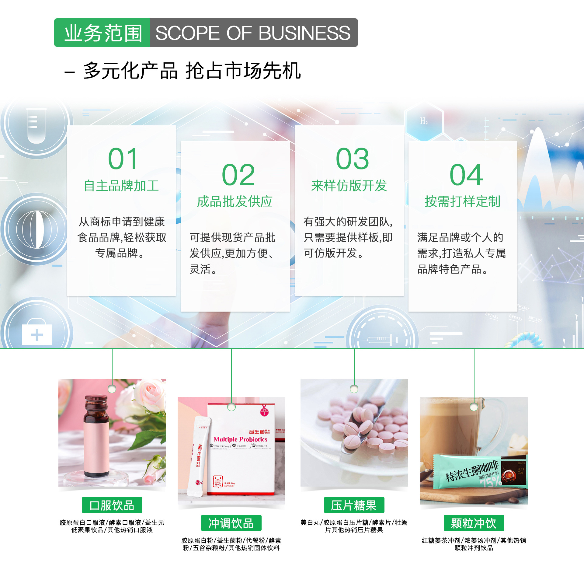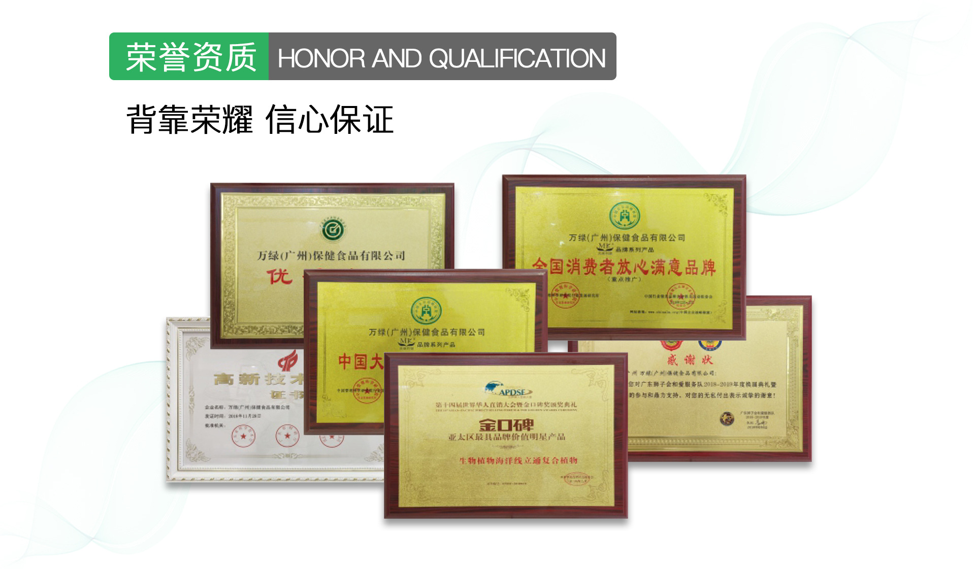 萬綠(廣州)保健食品有限公司 專注于健康領(lǐng)域的研發(fā)與生產(chǎn),主營片劑如人參鹿鞭片、vc片;固體飲料如益生菌、膠原蛋白粉、代餐粉、酵素粉,咖啡,飲品如膠原蛋白口服液,酵素液,膠原肽口服液等 專業(yè)訂制研發(fā)專屬產(chǎn)品,擁有完整、科學(xué)的質(zhì)量管理體系。 萬綠擁有強(qiáng)大的研發(fā)實(shí)力,擁有近百項(xiàng)專利,賦予產(chǎn)品更多附加值,萬綠工廠擁有SC、SGS等多項(xiàng)國內(nèi)外安全體系認(rèn)證,產(chǎn)品投保CPIC太平洋保險(xiǎn),與中國眾多上市企業(yè)和大型集團(tuán)企業(yè)建立緊密的合作伙伴關(guān)系,并得到中國科學(xué)院認(rèn)可,中科院授予萬綠為中醫(yī)中藥研發(fā)及產(chǎn)業(yè)轉(zhuǎn)化中心。擁有國內(nèi)外先進(jìn)的保健食品是生產(chǎn)設(shè)備和完整的生產(chǎn)能力。 占地面積4243平方米、建筑面積3008平方米,擁有現(xiàn)代化保健營養(yǎng)食品生產(chǎn)線2條、十萬級(jí)潔凈生產(chǎn)車間2000平方米,具備粉劑、顆粒劑、片劑、口服液等4種劑型保健營養(yǎng)食品的生產(chǎn)能力。萬綠公司以誠信、實(shí)力和產(chǎn)品質(zhì)量自持,只做良心產(chǎn)品,歡迎臨參觀考證。