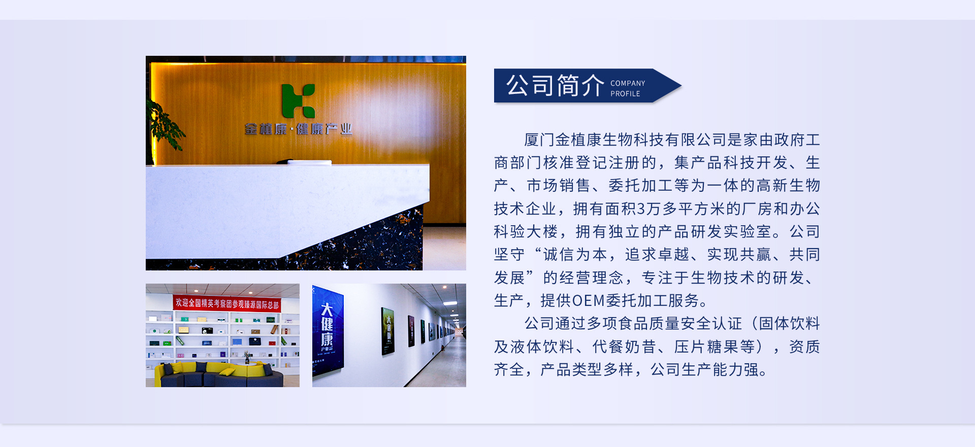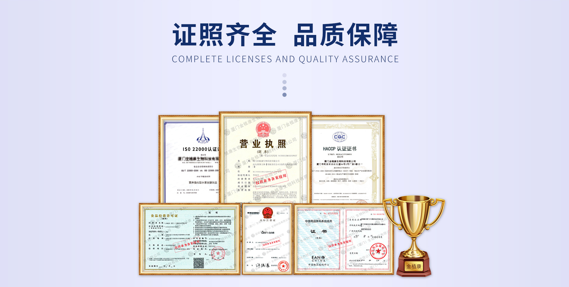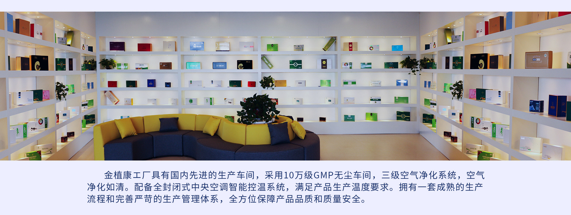 金植康工廠具有國內先進的生產車間,采用10萬級GMP無塵車間,三級空氣凈化系統,空氣凈化如清。配備全封閉式中央空調智能控溫系統,滿足產品生產溫度要求。擁有一套成熟的生產流程和完善嚴苛的生產管理體系,全方位保障產品品質和質量安全