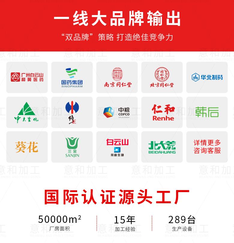 廣州意和集團秉承“感恩一切”的經營理念,于2018年在廣州正式成立,現已發展成一家集研發,加工,培訓為一體的大型廠家,旗下擁有三個生產基地;擁有消、妝、械三大證書,員工數360多人, 擁有38條生產線, 擁有高新現代化生產設備;歡迎各界人士來我集團參觀指導!咨詢OEM加工熱線:18818863250聶經理