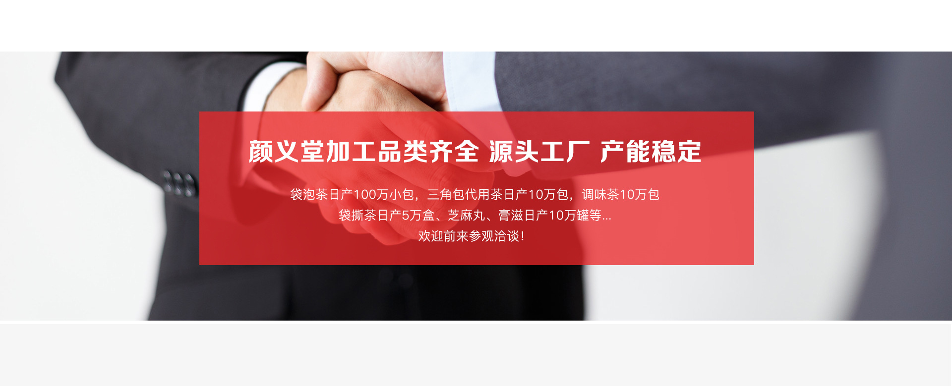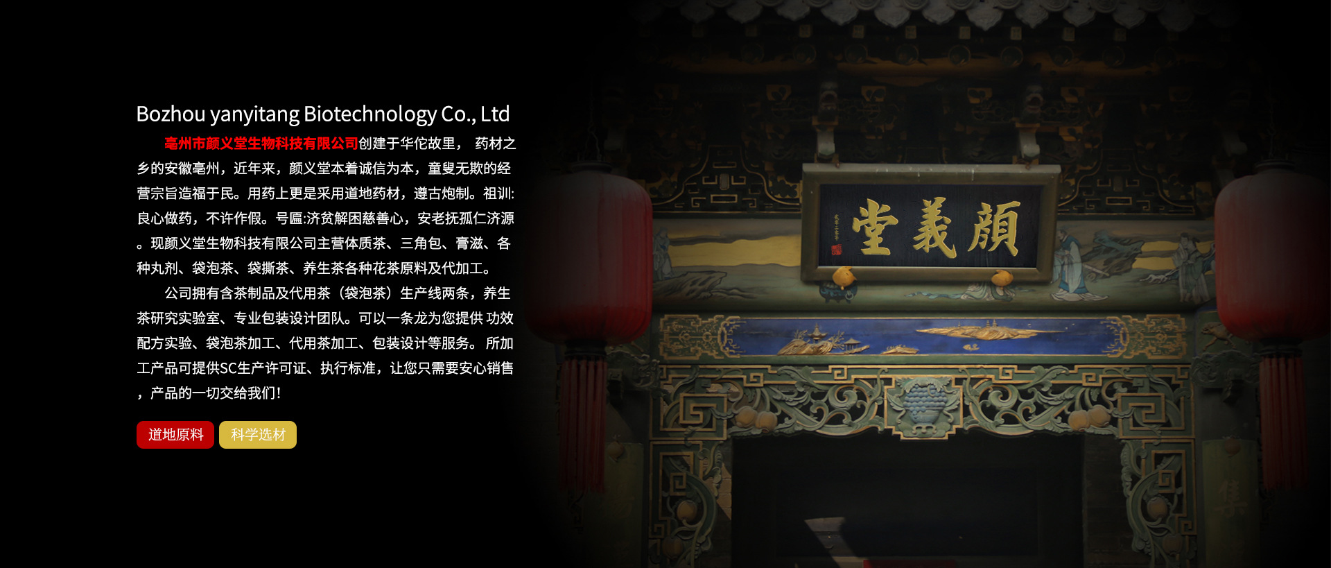 亳州市顏義堂生物科技有限公司 創建于華佗故里, 藥材之鄉的安徽亳州,近年來,顏義堂本著誠信為本,童叟無欺的經營宗旨造福于民。用藥上更是采用道地藥材,遵古炮制。祖訓:良心做藥,不許作假。號匾:濟貧解困慈善心,安老撫孤仁濟源。現顏義堂生物科技有限公司主營體質茶、三角包、水果片茶、袋泡、袋撕茶、養生茶、膏滋、丸劑代加工。公司擁有含茶制品及代用茶(袋泡茶)生產線兩條,養生茶研究實驗室、專業包裝設計團隊。可以一條龍為您提供功效配方實驗、袋泡茶加工、代用茶加工、包裝設計等服務。 所加工產品可提供SC生產許可證、執行標準,讓您只需要安心銷售,產品的一切交給我們!
