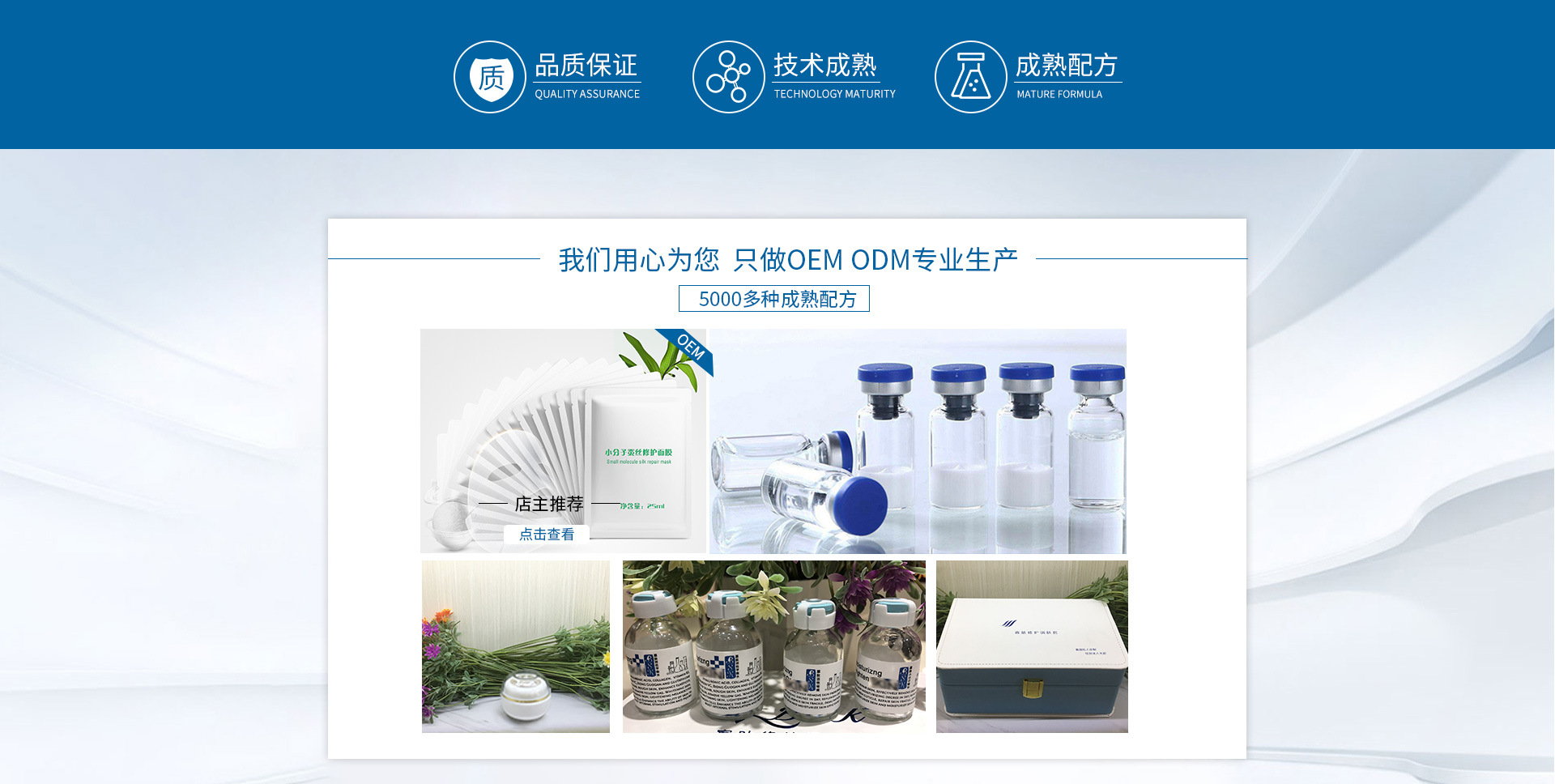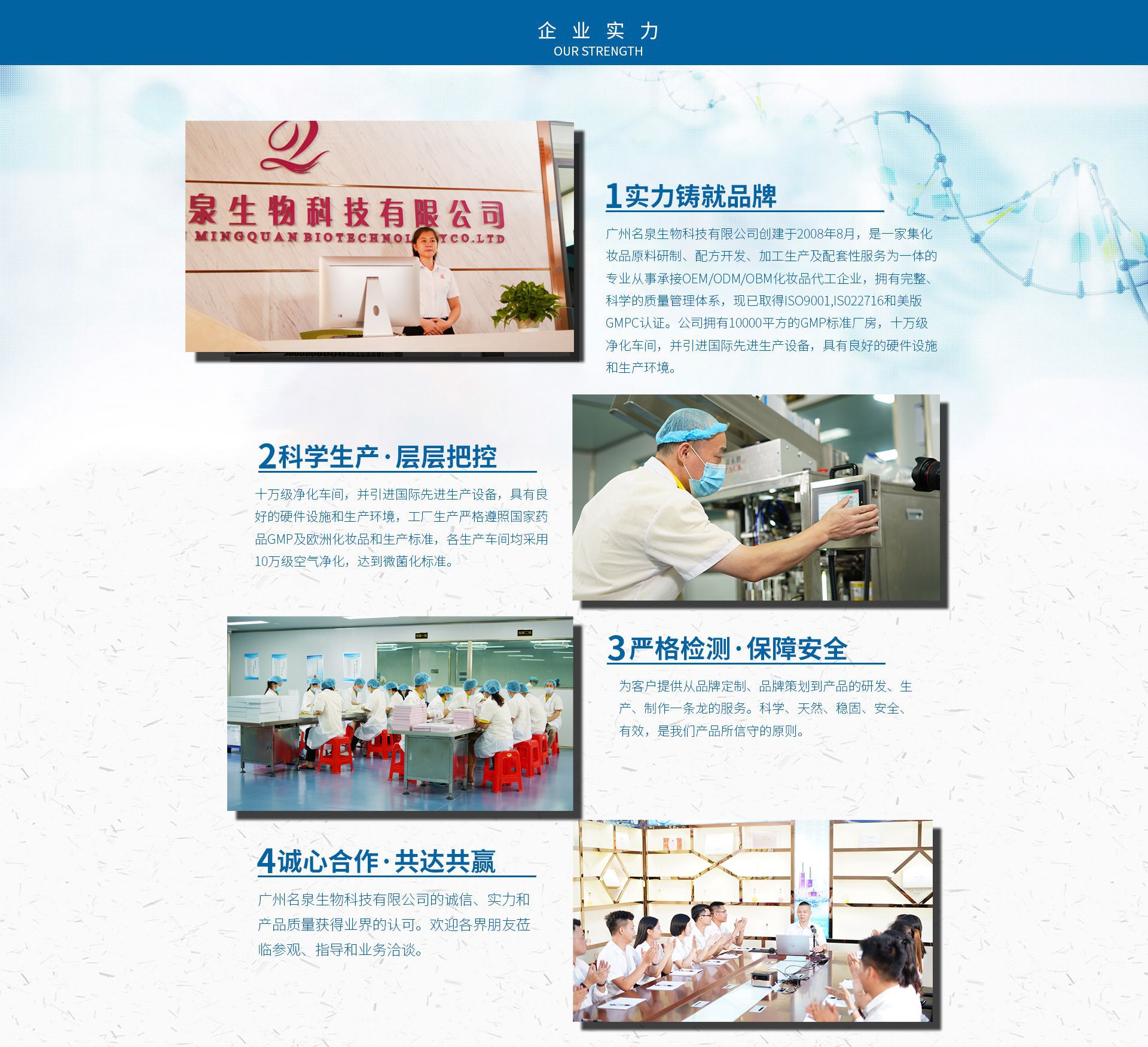 廣州名泉生物科技有限公司創建于2008年8月,是一家集化妝品原料研制、配方開發、加工生產及配套性服務為一體的專業從事承接OEM/ODM/OBM化妝品代工企業,擁有完整、科學的質量管理體系,現已取得ISO9001,IS022716和美版GMPC認證。公司擁有10000平方的GMP標準廠房,十萬級凈化車間,并引進國際先進生產設備,具有良好的硬件設施和生產環境,工廠生產嚴格遵照國家藥品GMP及歐洲化妝品和生產標準,各生產車間均采用10萬級空氣凈化,達到微菌化標準。為客戶提供從品牌定制、品牌策劃到產品的研發、生產、制作一條龍的服務。科學、天然、穩固、安全、有效,是我們產品所信守的原則。廣州名泉生物科技有限公司的誠信、實力和產品質量獲得業界的認可。歡迎各界朋友蒞臨參觀、指導和業務洽談。