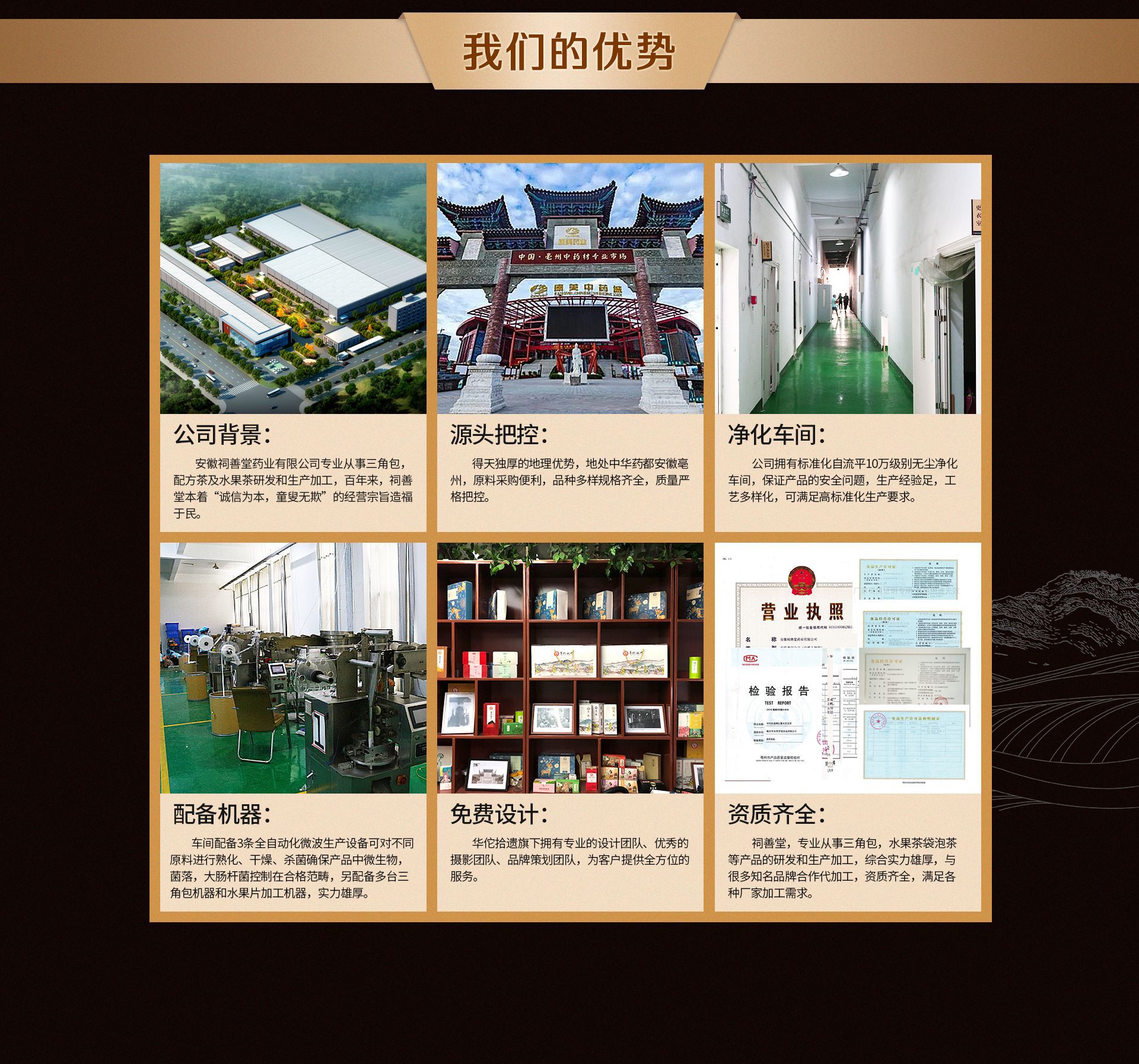 安徽祠善堂藥業有限公司是中藥、花茶、農副產品、花茶、三角包等產品專業生產加工的公司,擁有完整、科學的質量管理體系。安徽祠善堂藥業有限公司的誠信、實力和產品質量獲得業界的認可。歡迎各界朋友蒞臨參觀、指導和業務洽談。
