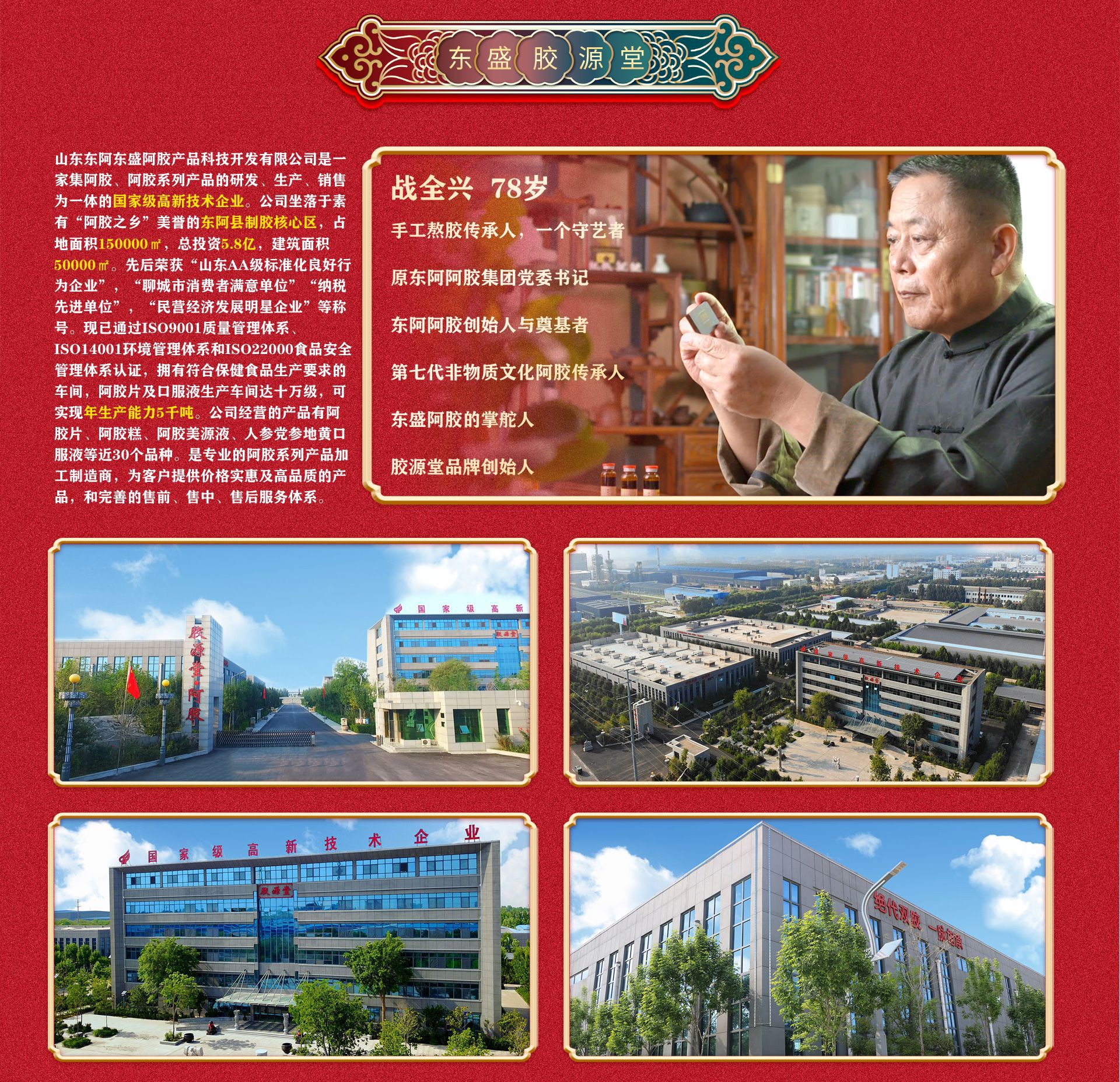 山東東阿東盛阿膠產品科技開發有限公司是一家集阿膠、阿膠系列產品的研發、生產、銷售為一體的現代化高新技術企業。公司坐落于素有“阿膠之鄉”美譽的東阿縣制膠核心區,占地面積200余畝,總投資5.8個億,建筑面積2.5萬平方米。先后榮獲“山東AA級標準化良好行為企業”,“聊城市消費者滿意單位”“納稅先進單位”,“民營經濟發展明星企業”等稱號。現已通過ISO9001質量管理體系、ISO14001環境管理體系和ISO22000食品安全管理體系認證,擁有符合保健食品生產要求的車間,阿膠片及口服液生產車間達十萬級,可實現年生產能力5千噸。公司經營的產品有阿膠片、阿膠糕、阿膠美源液、人參黨參地黃口服液等近30個品種。是專業的阿膠系列產品加工制造商,為客戶提供價格實惠及高品質的產品,和完善的售前、售中、售后服務體系。