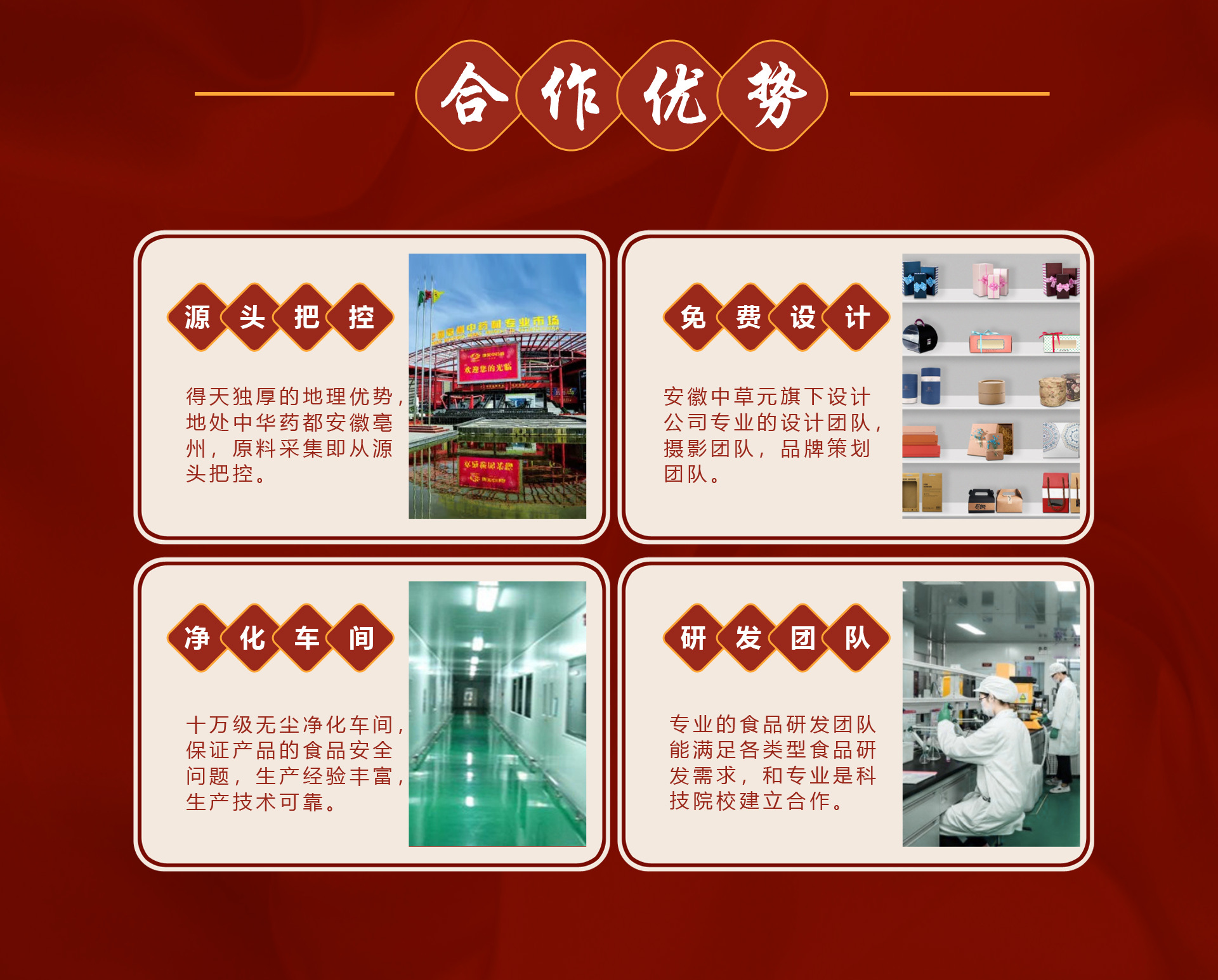 安徽中草元健康產業有限公司,于2020年成立,同時取得國家SC認證,廠區位于亳州高新區雙創產業園一期,現有廠房3000多平,擁有先進的生產設備、檢測設備以及專業的研發技術人員。集世界聞名的藥材市場-亳州地域優勢,花草茶原材料貨源純正充足;集生產與銷售為一體的綜合性企業、源頭工廠,專注于健康養生實力品牌。為客戶提供專業的,成套產品配方研發、包裝設計、推廣營銷、多品牌管理,提供實戰型的營銷解決方案。公司各類資質和生產設備齊全,車間按照SC標準設計,出貨效率高,服務認真負責,是本市較大較專業的代工企業。