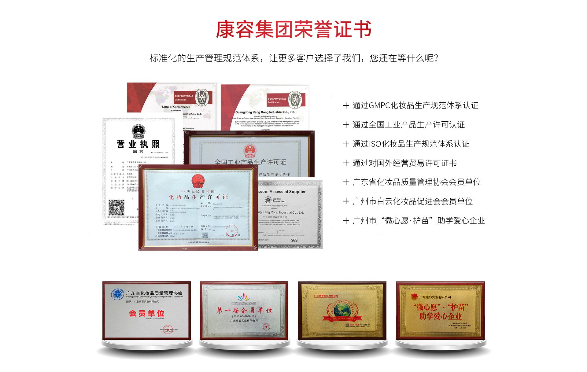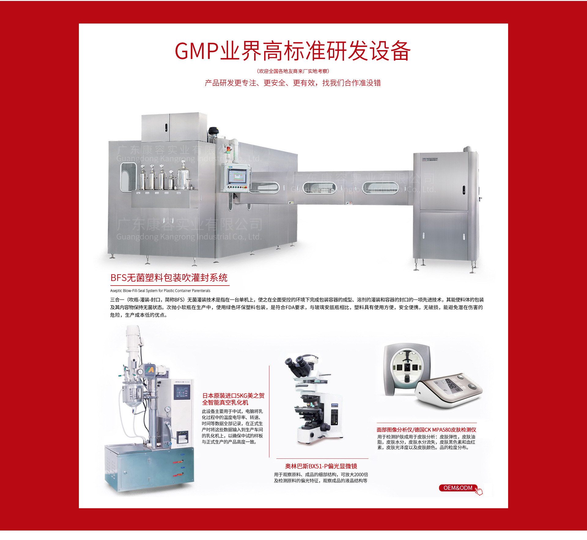廣東康容集團公司依托廣州康蓉科技有限公司的厚重積淀,由領軍企業廣東康容實業有限公司發起成立的大型化妝品集團公司。公司位于廣州市白云區神山工業園鎮中北路。整個生產園區占地3萬多平方米,由辦公樓、廠房一、廠房二、成品大樓、宿舍樓、連廊等組成“梁派”建筑群,前有中心花園廣場,后有敞篷飄香大廳。廠區容積率低,綠化率高,名木相間,綠樹成蔭。假山、人造瀑布、國際標準網球場、石桌石凳石碑串聯點綴,構成了“廠在園中,園在廠中”的花園式生產園區。 一、經營內容 公司產業涵蓋了化妝品、次拋軟安瓶、生物凍干、消字號等高新科技產業園以及化妝品機械等范圍,形成了從產業布局、產品研發、生產銷售到產業服務的“多領域”、“ 一條龍”的業態鏈條。生產經營范圍以OEM\ODM為主,自有品牌為輔,即“賣生產”與“賣產品”相結合,實行“2+N”發展模式。