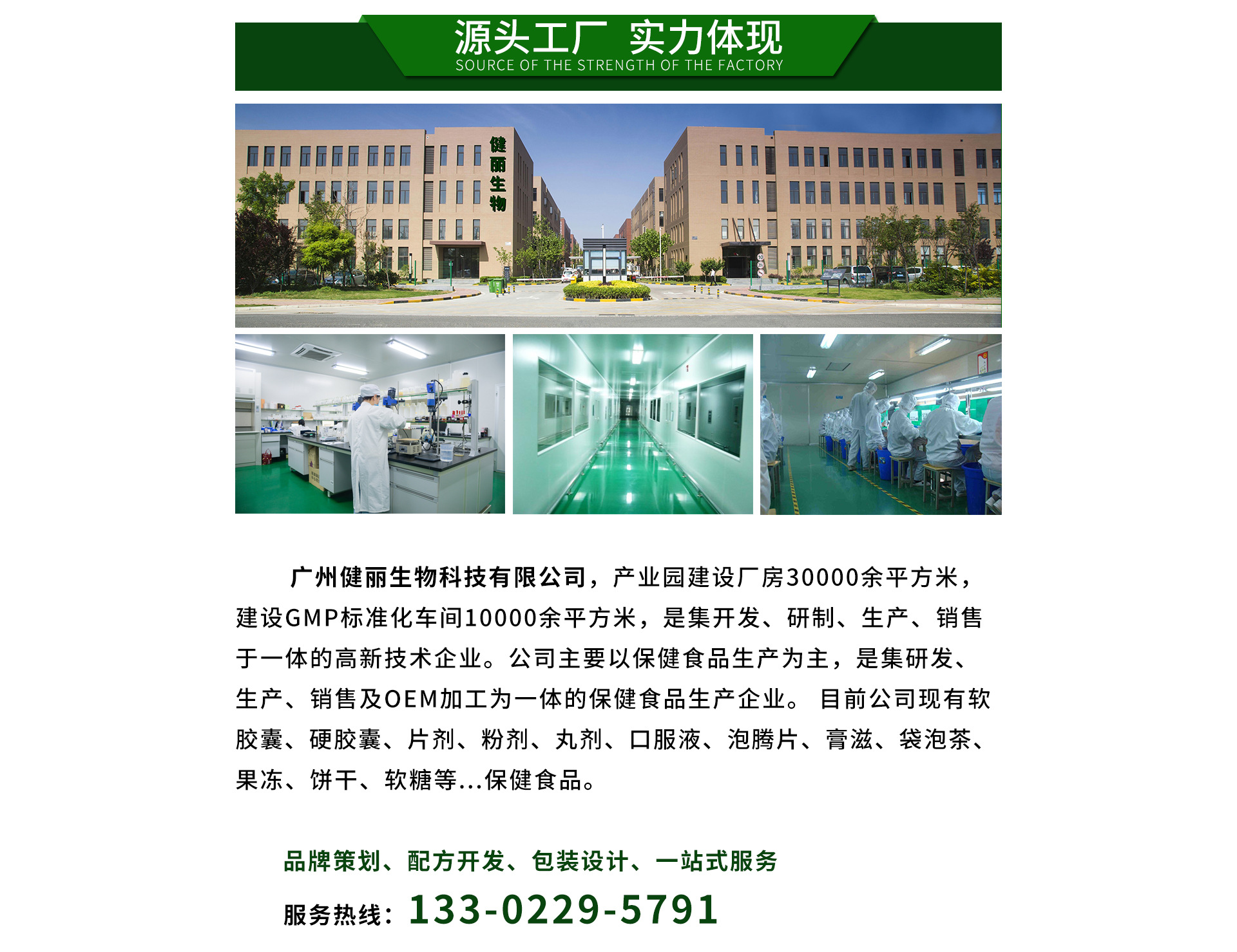 廣州健麗生物科技有限公司,產業園建設廠房50000余平方米,建設GMP標準化車間10000余平方米,是集開發、研制、生產、銷售于一體的高新技術企業。公司主要以保健食品生產為主,是集研發、生產、銷售及OEM加工為一體的保健食品生產企業。 目前公司現有軟膠囊、硬膠囊、片劑、粉劑、丸劑、口服液、泡騰片、膏滋、袋泡茶、果凍、餅干、軟糖等...保健食品。