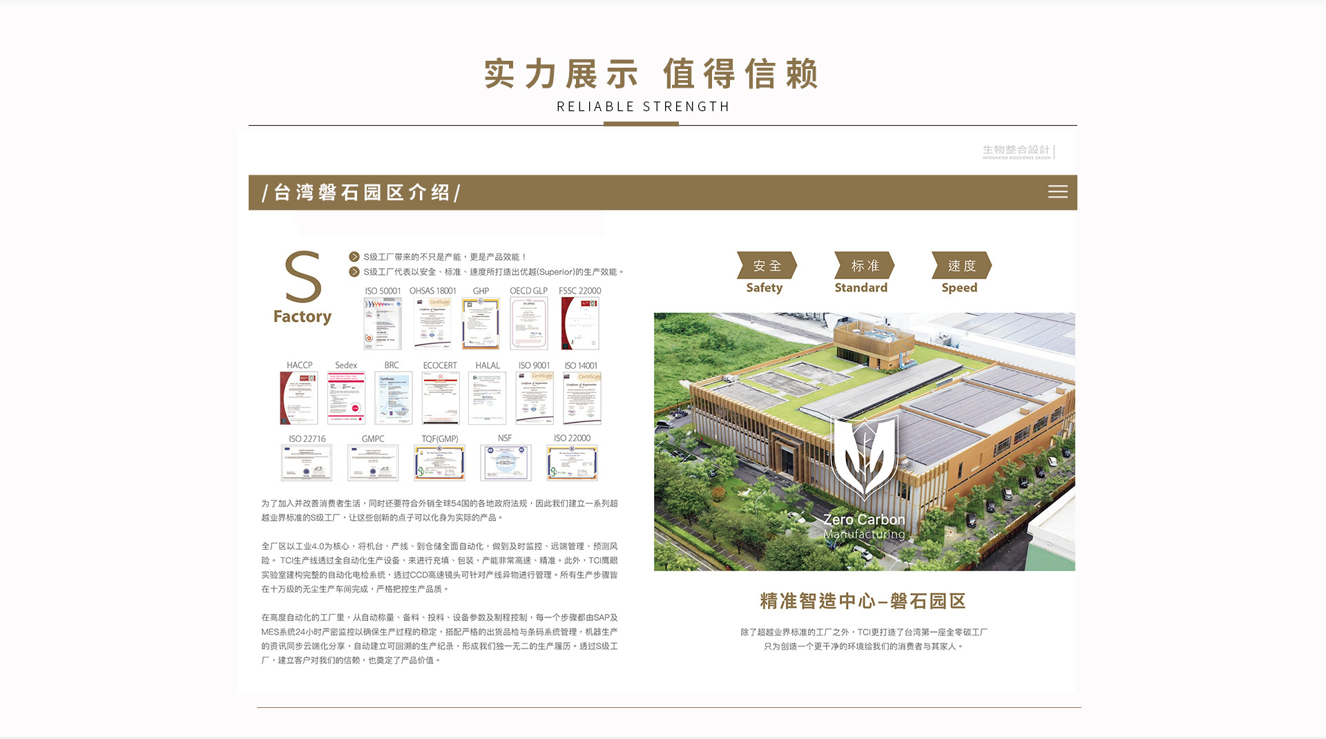 上海百岳特,為大江生醫集團在中國的子公司之一。我們是專業保健品及護膚品開發及代加工廠商,目前有多種創新性產品,包含功能性保健品(口服液、固體飲料、片劑、膠囊)與護膚品(面膜等)。