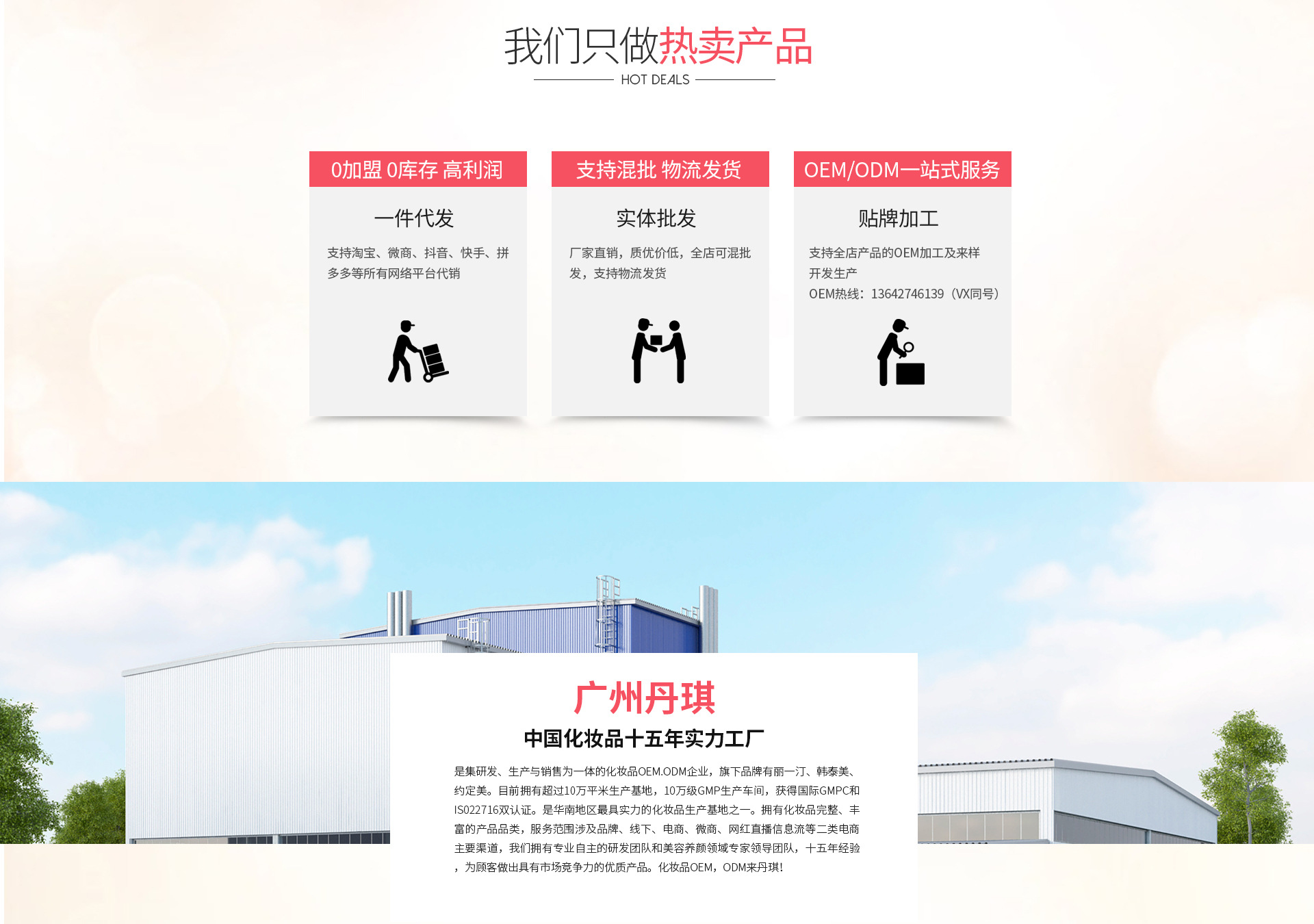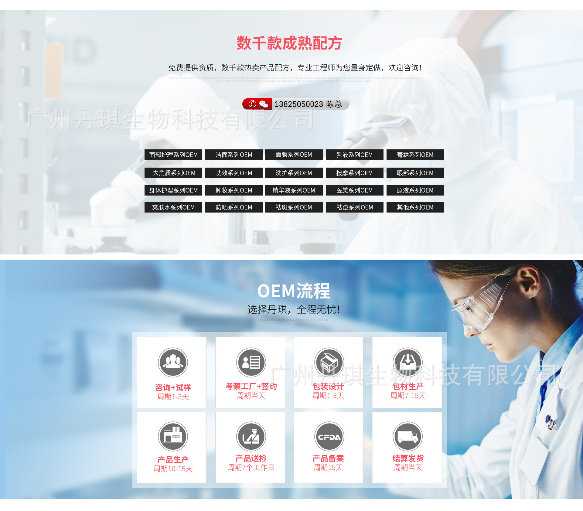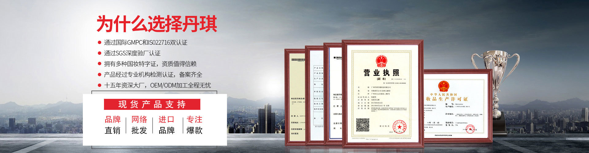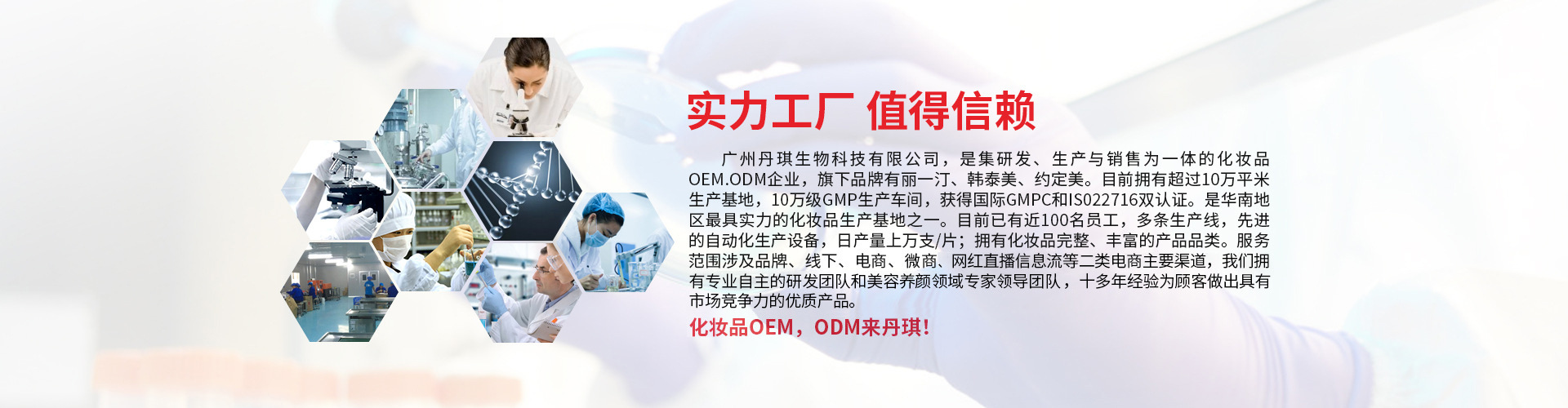 廣州丹琪生物科技有限公司,是集研發、生產與銷售為一體的化妝品OEM.ODM企業,旗下品牌有麗一汀、韓泰美、約定美。目前擁有超過10萬平米生產基地,10萬級GMP生產車間,獲得國際GMPC和IS022716雙認證。是華南地區最具實力的化妝品生產基地之一,是接受政府及公眾監督的三證齊全、質量保證實力加工廠。目前已有近100名員工,多條生產線,先進的自動化生產設備,日產量上萬支/片;擁有化妝品完整、豐富的產品品類。服務范圍涉及品牌、線下、電商、微商等主流渠道,我們擁有專業自主的研發團隊和美容養顏領域專家領導團隊,十多年經驗,為顧客做出具有市場競爭力的優質產品。客戶遍布國內外,受到客戶的一致認可。化妝品OEM,ODM來丹琪!歡迎社會各界、新老客戶蒞臨工廠指導、交流、洽談業務合作。