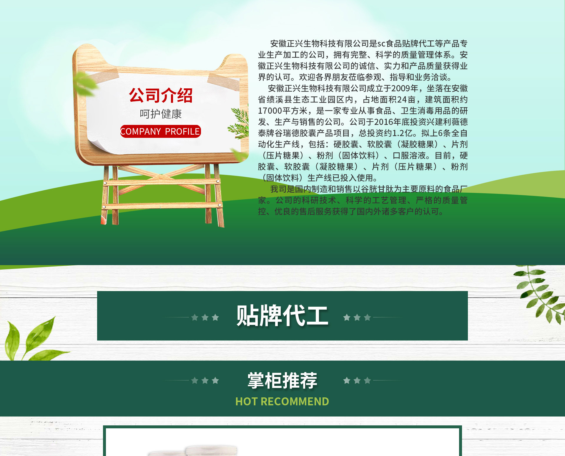 安徽正興生物科技有限公司成立于2009年,坐落在安徽省績溪縣生態(tài)工業(yè)園區(qū)內(nèi),占地面積24畝,建筑面積約17000平方米,是一家專業(yè)從事保健食品、食品、衛(wèi)生消毒用品的研發(fā)、生產(chǎn)與銷售的公司。 公司于2016年底投資興建利薇德泰牌谷瑞德膠囊產(chǎn)品項(xiàng)目,總投資約1.2億。擬上8條全自動(dòng)化生產(chǎn)線,包括:硬膠囊、軟膠囊(凝膠糖果)、片劑(壓片糖果)、粉劑(固體飲料)、袋泡茶、口服溶液。目前,硬膠囊、軟膠囊(凝膠糖果)、片劑(壓片糖果)、粉劑(固體飲料)、袋泡茶生產(chǎn)線已投入使用。 我司是國內(nèi)首家制造和銷售以谷胱甘肽為主要原料的保健食品廠家。公司以權(quán)威的科研技術(shù)、科學(xué)的工藝管理、嚴(yán)格的質(zhì)量管控、優(yōu)質(zhì)的售后服務(wù)獲得了國內(nèi)外諸多客戶的認(rèn)可。