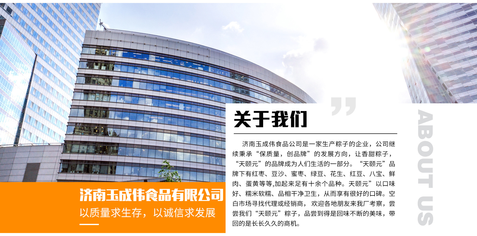 濟南玉成偉食品公司是一家專業生產粽子的企業,公司位于美麗的泉城濟南,在擁抱泉水文化的同時,擴大了粽子文化在北方的發展和積淀。公司秉承質量至上的宗旨,以發揚北方粽子文化為理念,生產出可口的粽子,更適合北方人大眾化口味,從而打造出“天頤元”品牌。公司繼續秉承“保質量,創品牌”的發展方向,讓香甜粽子,“天頤元”的品牌成為人們生活的一部分。