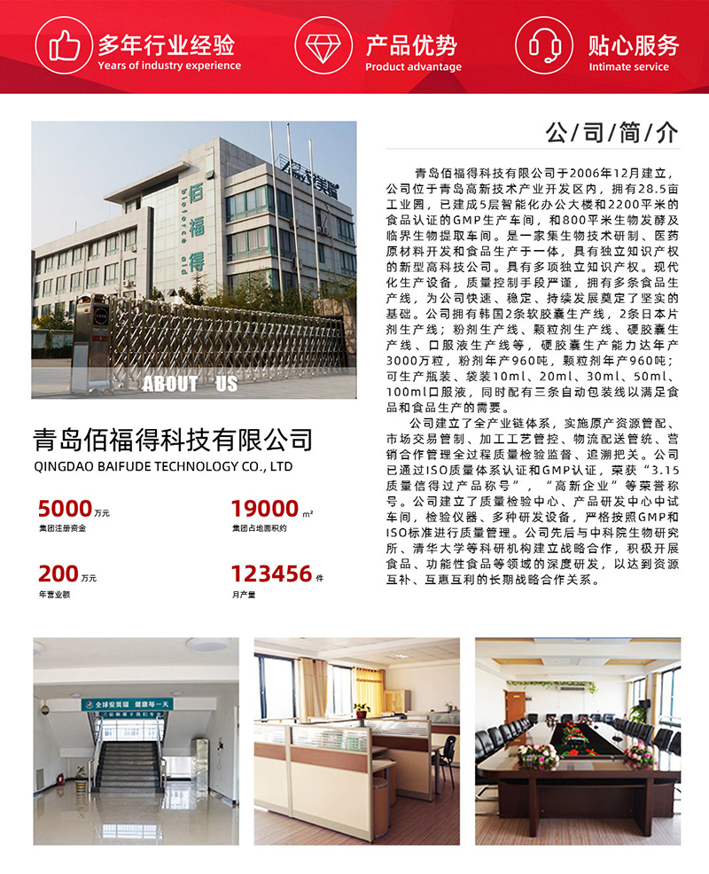 青島佰福得科技有限公司于2006年12月建立,公司位于青島高新技術產業開發區內,擁月28.5畝工業園,已建成5層智能化辦公大樓和2200平術的食品認證的GMP生產車間,和800平米生物發酵及臨界生物提取車間。是一家集生物技術研制、醫藥原材料開發和食品生產于一體,具有獨立知識產權的新型高科技公司。具有多項獨立知識產權。現代化生產設備,質量控制手段嚴謹,擁有多條食品生產線,為公司快速、穩定、持續發展奠定了堅實的基礎。公司擁有韓國2條軟膠囊生產線、2條日本片劑生產線;粉劑生產線、顆粒劑生產線、硬膠囊生產線、口服液生產線等,硬膠囊生產能力達年產3000萬粒,粉劑年產960噸,顆粒劑年產960噸;可生產瓶裝、袋裝10ml、20ml、30ml、50ml、100ml口服液,同時配有三條自動包裝線以滿足食品和食品生產的需要。