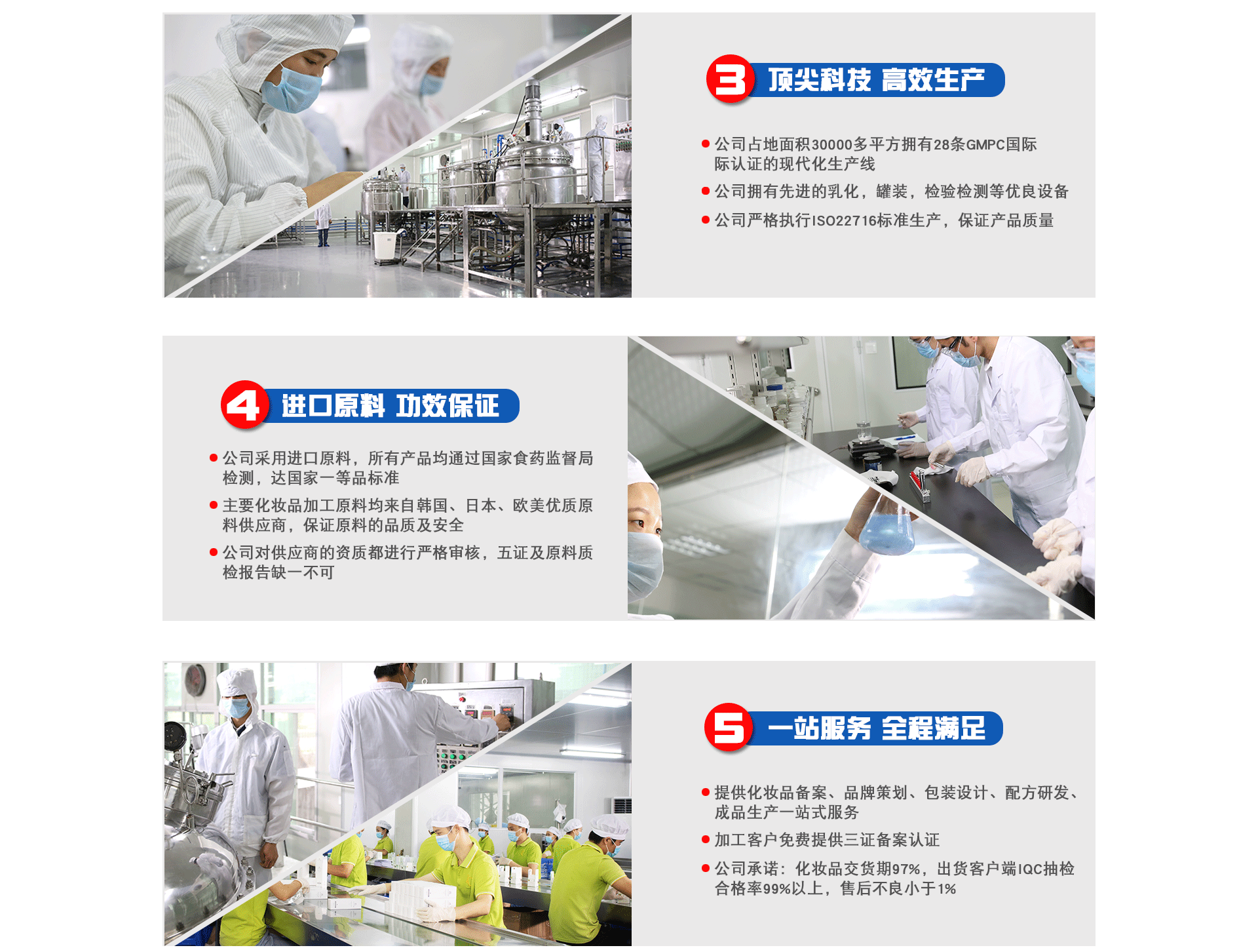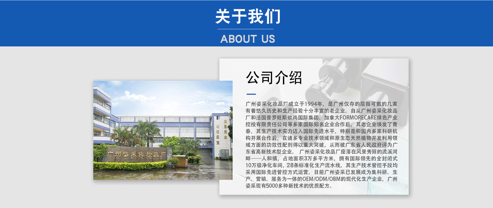 廣州姿采化妝品廠成立于1994年,是廣州僅存的屈指可數的幾家有著悠久歷史和生產經驗十分豐富的老企業。自從廣州姿采化妝品廠和法國普羅旺斯歐尚國際集團、加拿大FORMORECARE綠色產業控投有限責任公司等多家國際知名企業合作后,其老企業煥發了青春,其生產技術實力邁入國際先進水平,特別是和國內多家科研機構開展合作后,在諸多專業技術領域和原生態天然植物開發利用領域方面的功效性配劑得以重大突破,從而被廣東省人民政府評為廣東省高新技術型企業。 廣州姿采化妝品廠座落在風景秀麗的流溪河畔——人和鎮,總面積3萬多平方米,擁有國際領先的全封閉式10萬級凈化車間,28條標準化生產流水線,其生產技術管控手段均采用國際先進管控方式運營,目前廣州姿采已發展成為集科研、生產、營銷、服務為一體的OEM/ODM/OBM的現代化生產企業,廣州姿采現有5000多種新技術的優質配方