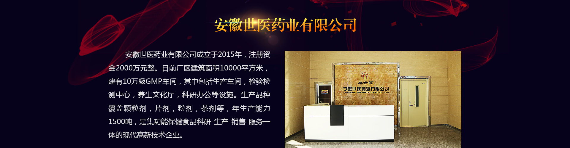 安徽世醫藥業有限公司成立于2015年,注冊資金2000萬圓整,公司有員工180人,目前廠區建筑面積10000平方米,建有10萬級GMP車間,其中包括生產車間、檢驗檢測中心、養生文化廳、科研辦公等設施。生產品種覆蓋顆粒劑、片劑、粉劑、茶劑等年生產能力1500噸,是集功能保健食品科研--生產-銷售-服務一體的現代高新技術企業。