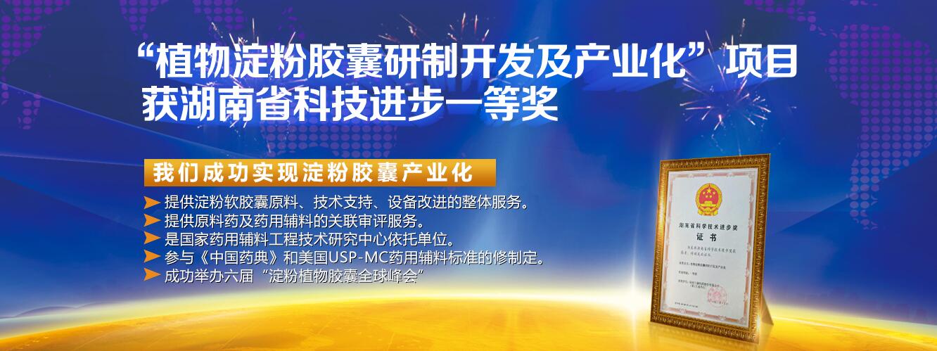 公司是中國藥用輔料行業內優秀企業,擁有藥用輔料品種126個,原料藥品種69個,成品藥批準文號284個。其中,淀粉植物膠囊是具有自主知識產權的核心產品,其技術國際領先,是膠囊行業的重大突破。淀粉膠囊產品在國內外申請專利97項,并獲“湖南省科技進步獎一等獎”。