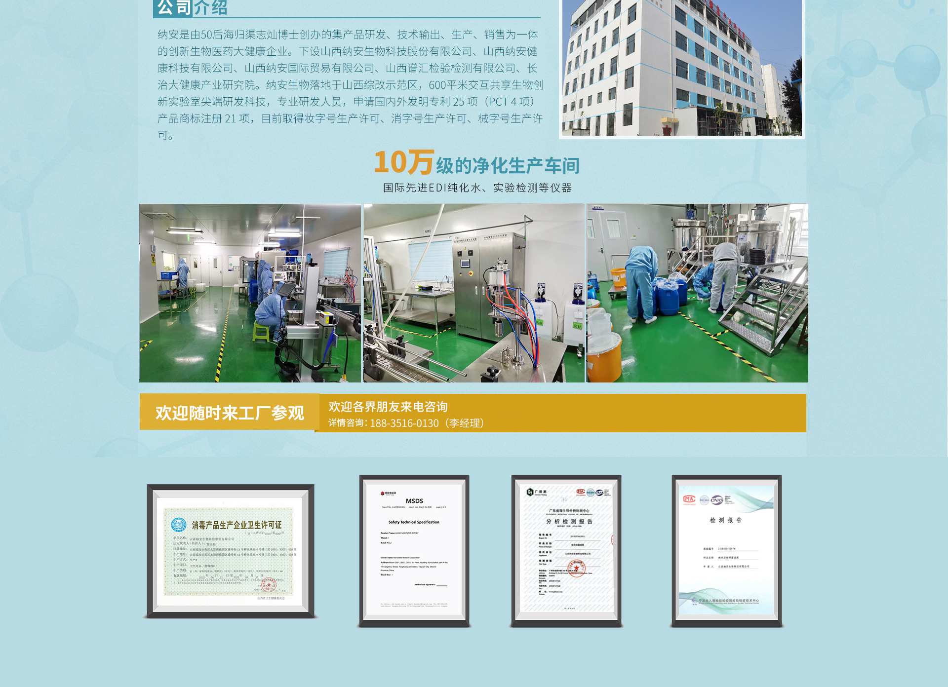 公司面積10000㎡,護(hù)膚品生產(chǎn)規(guī)模屬于大規(guī)模, 潔凈生產(chǎn)車間面積1700㎡、產(chǎn)品檢測(cè)中心面積333 ㎡、庫(kù)房面積1700㎡、動(dòng)力車間面積253㎡。 公司配有專業(yè)的研發(fā)團(tuán)隊(duì),可做新產(chǎn)品、新原 料、新工藝開(kāi)發(fā)和研究。目前已獲得化妝品生產(chǎn)許 可證,妝字號(hào)生產(chǎn)線已投產(chǎn)的有:面膜生產(chǎn)灌裝線、 乳霜生產(chǎn)灌裝線、洗面奶生產(chǎn)灌裝線、護(hù)膚水生產(chǎn) 灌裝線、精油生產(chǎn)灌裝線,沐浴露生產(chǎn)灌裝一站式 化妝品加工服務(wù)。 研發(fā)團(tuán)隊(duì)12人,博士2人,研究生10人。生產(chǎn)質(zhì) 量團(tuán)隊(duì)專業(yè)人員27人,研究生3人,本科15人。