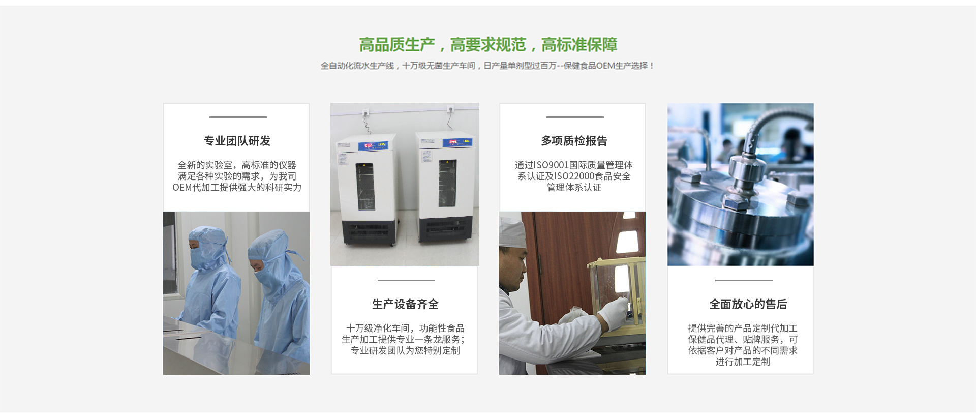 公司專注于功能性食品的研發、生產、銷售。所研制的功能性保健品、美容產品,配方合理、功效顯著深受廣大客戶朋友、消費者追棒。 公司擁有食品生產許可證、國家商檢局頒發的出口食品基地備案證書、保健品GMP證書和HACCP國際食品生產認證,目前在國外注冊出口了30多個保健品。 我們結合新原料(藥食同源)、新配方(復方獨家配伍)、新工藝(低溫萃取)、新技術(微粉化技術)、新設備(進口高端設備)“五新”核心優勢,并與中醫科學院中醫研究所深度合作,研發50多款健康產品
