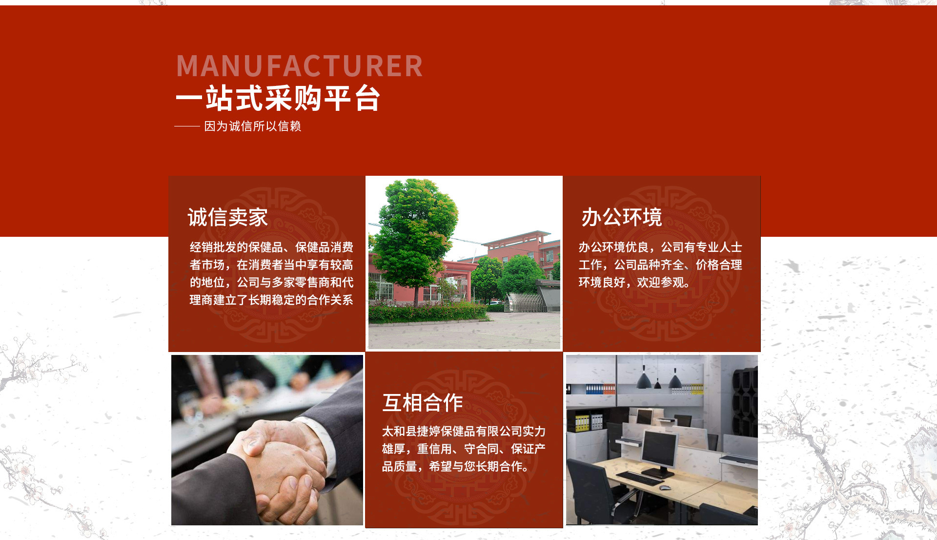 太和縣捷婷保健品有限公司 經銷批發的保健品、保健品暢銷消費者市場,在消費者當中享有較高的地位,公司與多家零售商和代理商建立了長期穩定的合作關系。太和縣捷婷保健品有限公司經銷的保健品、保健品品種齊全、價格合理。太和縣捷婷保健品有限公司實力雄厚,重信用、守合同、保證產品質量,以多品種經營特色和薄利多銷的原則,贏得了廣大客戶的信任。