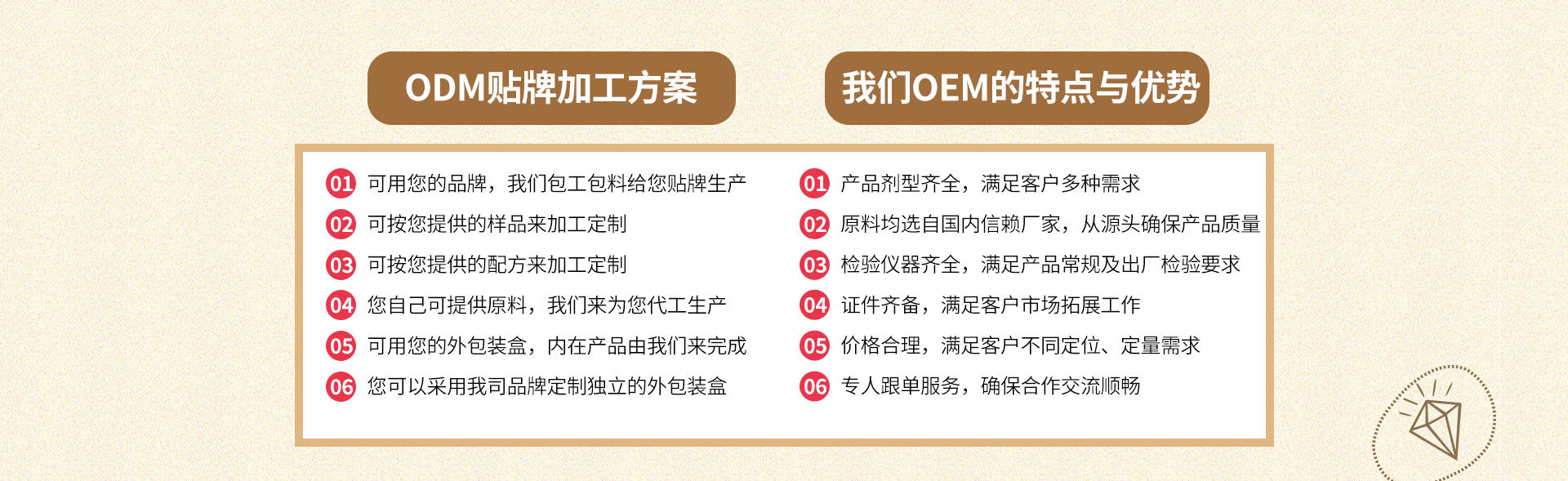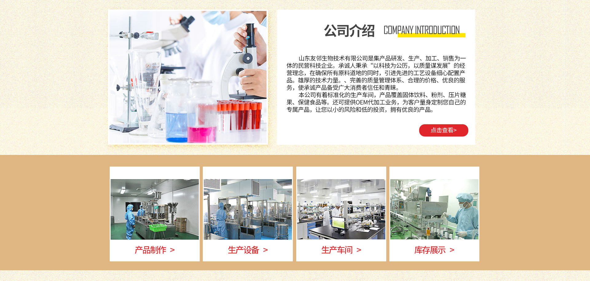 本公司有著標準化的生產車間,產品覆蓋固體飲料、粉劑、壓片糖果、特膳食品、保健食品等。還可提供OEM代加工業務,為客戶量身定制您自己的專屬產品,讓您以小的風險和低的投資,擁有優質的產品。山東有鄰藥業有限公司真誠歡迎廣大新老客戶蒞臨指導,洽談業務!我們一直在努力,有大家的關注和支持,相信我們會做得更好!