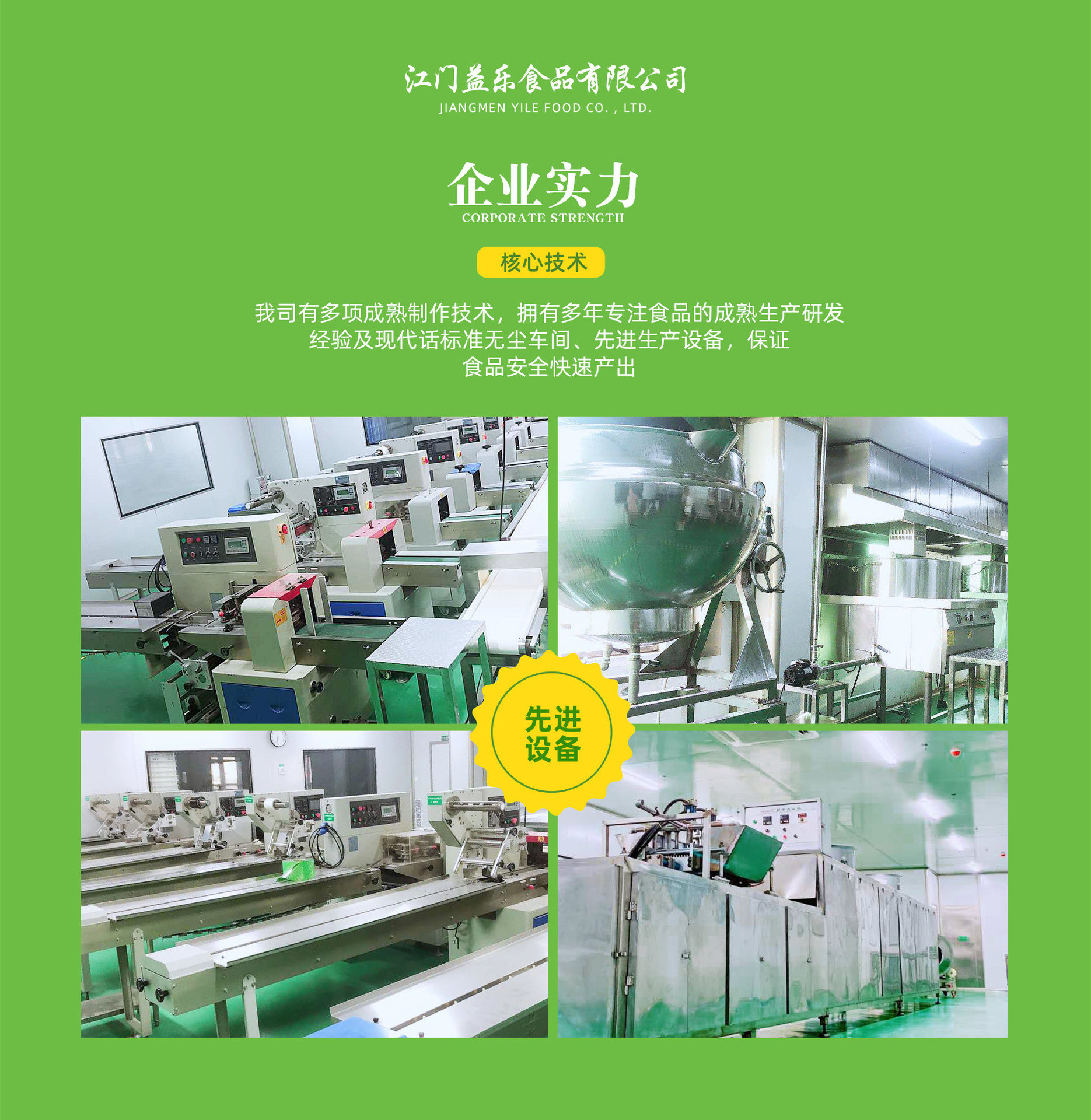 江門市益樂食品有限公司是生產食品、大健康食品、食品包裝等產品專業生產加工的公司,擁有十年專業經驗,擁有完整、科學的質量管理體系。本公司的誠信、實力和產品質量獲得業界的認可。歡迎各界朋友蒞臨參觀、指導和業務洽談。