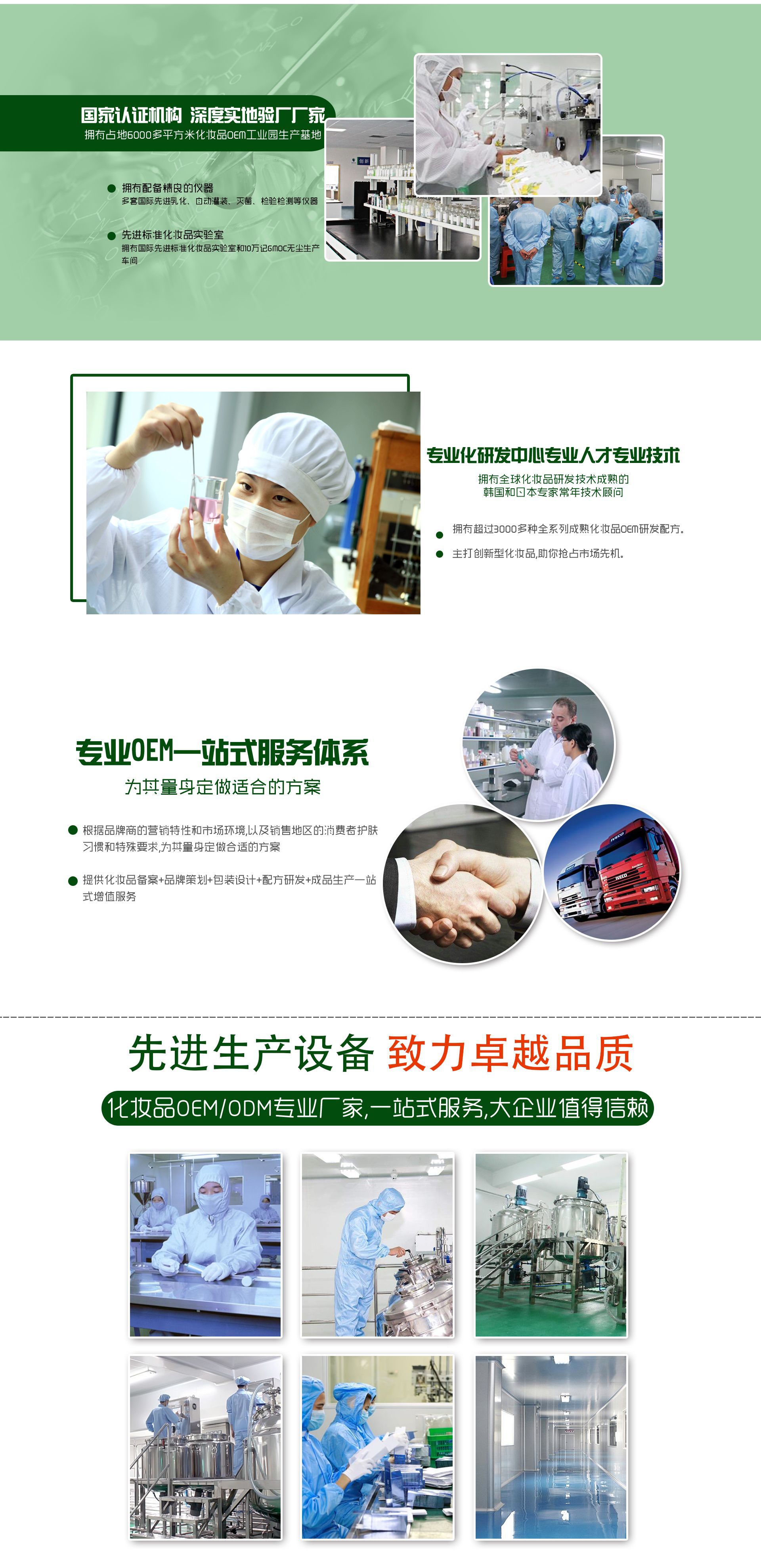 年生產(chǎn)能力達(dá)數(shù)千噸的大型化妝品生產(chǎn)基地,工廠占地面積2萬平方米,全套生產(chǎn)線嚴(yán)格按GMP標(biāo)準(zhǔn)設(shè)計投產(chǎn),集技術(shù)研發(fā)、生產(chǎn)、銷售、ODM/OEM加工定制于一體、公司配備有先進(jìn)齊全的研發(fā)設(shè)備及精密檢測儀器,提供完善的質(zhì)量檢測體系和產(chǎn)品質(zhì)量控制體系。