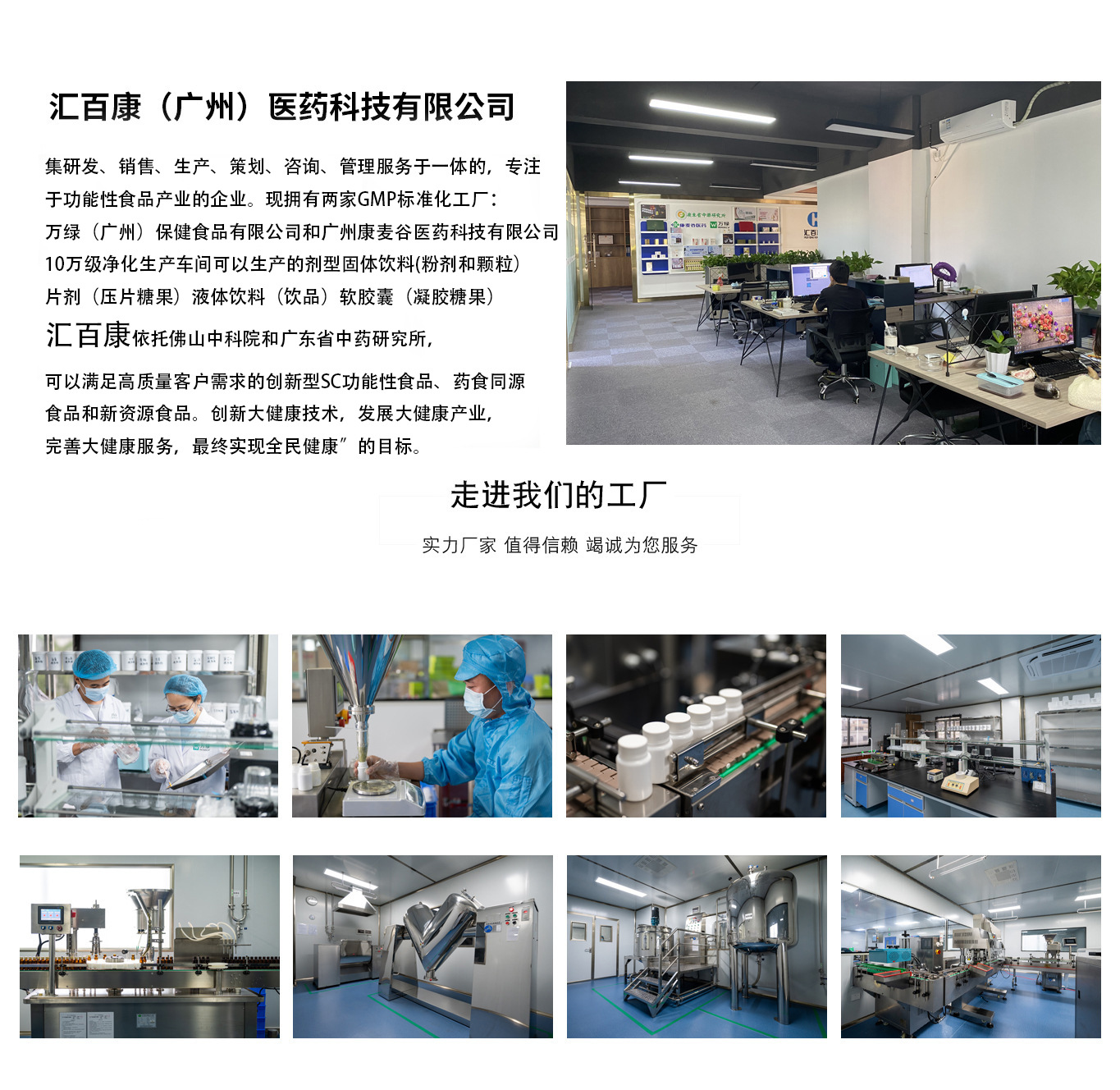 匯百康(廣州)醫(yī)藥科技有限公司集研發(fā)、銷售、生產、策劃、咨詢、管理服務于一體的,專注于功能性食品產業(yè)的企業(yè)。現(xiàn)擁有兩家GMP標準化工廠:萬綠(廣州)保健食品有限公司和廣州康麥谷醫(yī)藥科技有限公司,10萬級凈化生產車間可以生產的劑型固體飲料(粉劑和顆粒)片劑(壓片糖果)液體飲料(飲品)軟膠囊(凝膠糖果) 匯百康依托佛山中科院和廣東省中藥研究所,可以滿足高質量客戶需求的創(chuàng)新型SC功能性食品、藥食同源食品和新資源食品。創(chuàng)新大健康技術,發(fā)展大健康產業(yè),完善大健康服務,最終實現(xiàn)“全民健康”的目標。