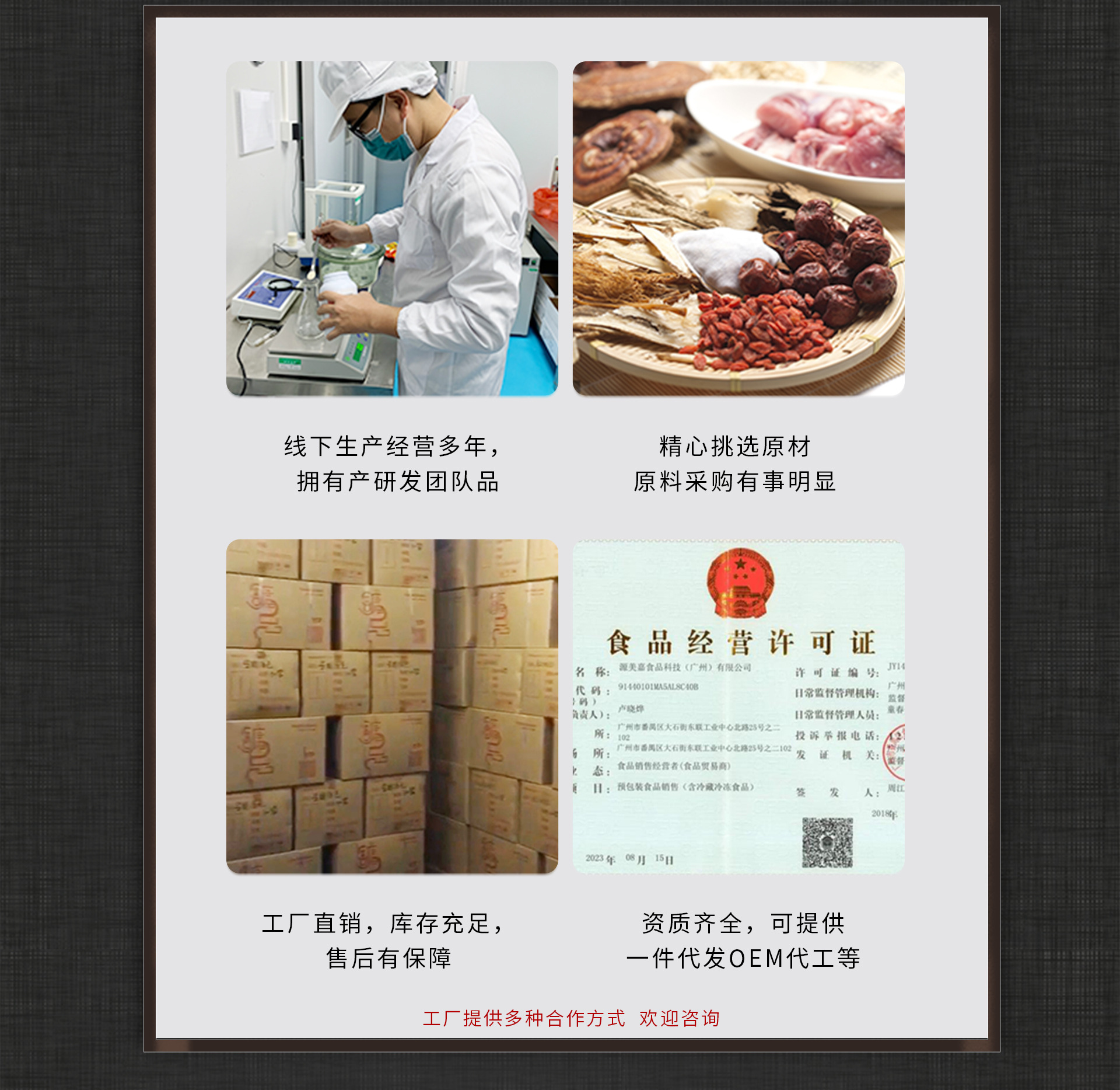 源美嘉食品公司是一家依法登記,注重國家權威部門的批準,依據法律、法規生產與經營的企業。 經營的范圍:煲湯料、海產品干貨、代用茶、調味茶、水果制品、五谷雜糧、等多元化的食品企業,產品的研發、生產、包裝一條龍,有經驗豐富的營養師研發、指揮。生產車間有大型的微波殺菌消毒、自動稱重、封口機等進口及國產的先進機械若干臺,由經驗豐富的技術師現場指導生產,公司有專業的化驗室,聘請了專業化驗人員,對食材原料的檢查,化驗、確保廣大顧客吃得放心,吃得健康,一直以來本公司產品質量與誠信深得同行以及顧客們的認可與信賴。