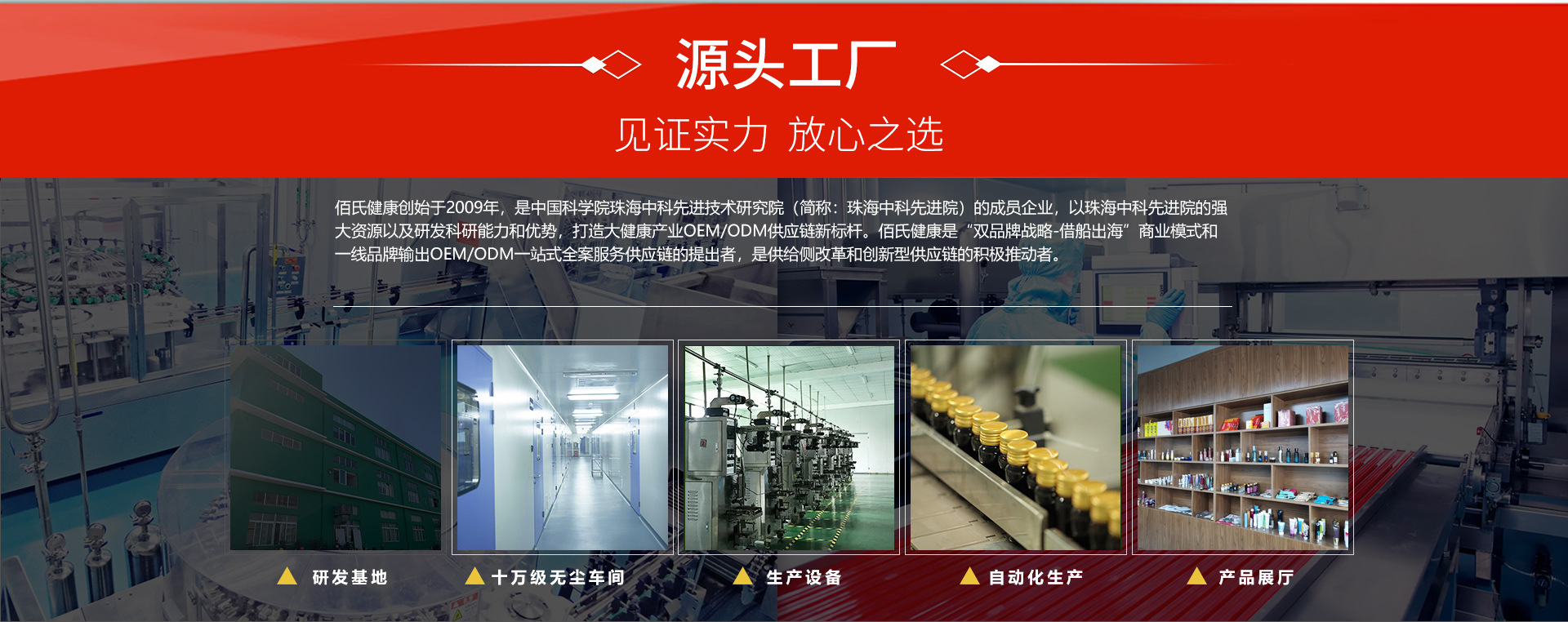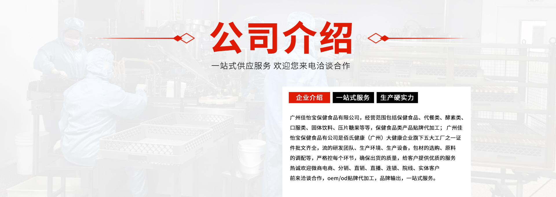 廣州佳怡寶保健食品有限公司,經營范圍包括保健食品制造;醬油、食醋及類似制品制造;其他調味品、發酵制品制造;糖果、巧克力制造;預包裝食品批發;調味品批發;酒類批發;酒類零售等等,保健食品類產品貼牌代加工; 廣州佳怡寶保健食品有限公司是佰氏健康(廣州)大健康企業旗下五大工廠之一,證件批文齊全,一流的研發團隊、生產環境、生產設備,包材的選購、原料的調配等,嚴格把控每個環節,確保出貨的質量,給客戶提供優質的服務。 熱誠歡迎微商、電商、分銷、直銷、直播、連鎖、院線、實體客戶前來洽談合作,oem/odm貼牌代加工,品牌輸出,一站式服務。
