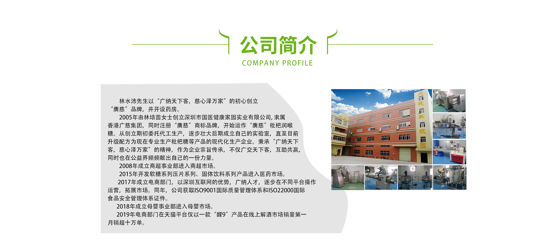 深圳市國(guó)醫(yī)健康家園實(shí)業(yè)有限公司從2005年成立至今, 主營(yíng)業(yè)務(wù)有生產(chǎn)銷售硬質(zhì)糖果、壓片糖果、植物凝膠糖果、固體飲料、代用茶等,是一家專業(yè)從事生物健康領(lǐng)域產(chǎn)品的研發(fā)、生產(chǎn)、銷售為一體的綜合性高科技術(shù)企業(yè)。生產(chǎn)工廠備有多套先進(jìn)的進(jìn)口生產(chǎn)加工設(shè)備,實(shí)現(xiàn)了全自動(dòng)流水化作業(yè),品質(zhì)好,產(chǎn)量高,成本低等優(yōu)勢(shì),公司采用完整、科學(xué)的質(zhì)量管理體系,通過國(guó)內(nèi)國(guó)際的認(rèn)證要求。深圳市國(guó)醫(yī)健康家園實(shí)業(yè)有限公司的誠(chéng)信、實(shí)力和產(chǎn)品質(zhì)量獲得業(yè)界的認(rèn)可,歡迎各界朋友蒞臨參觀、指導(dǎo)和業(yè)務(wù)洽談。