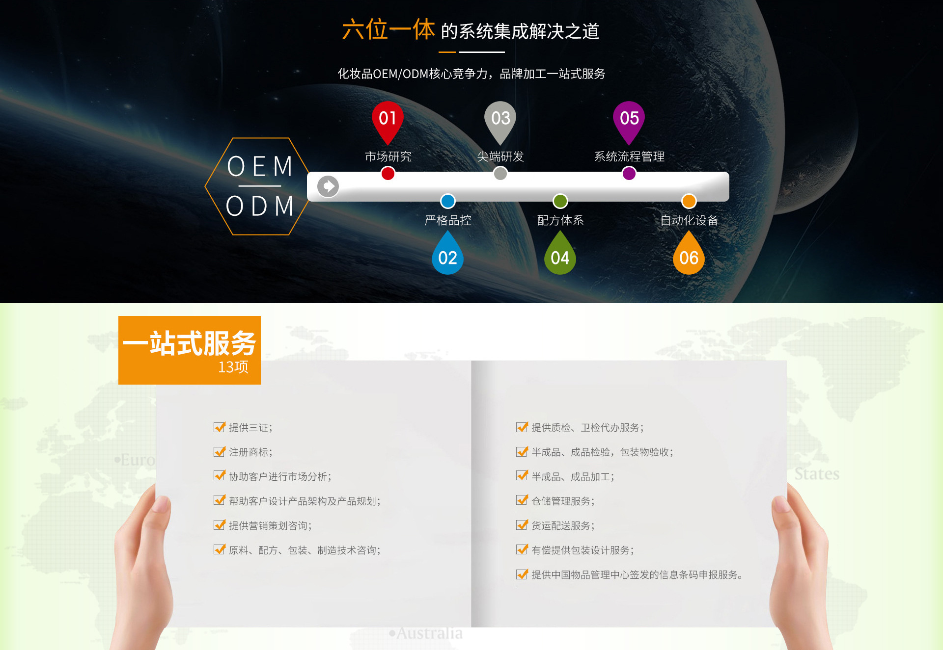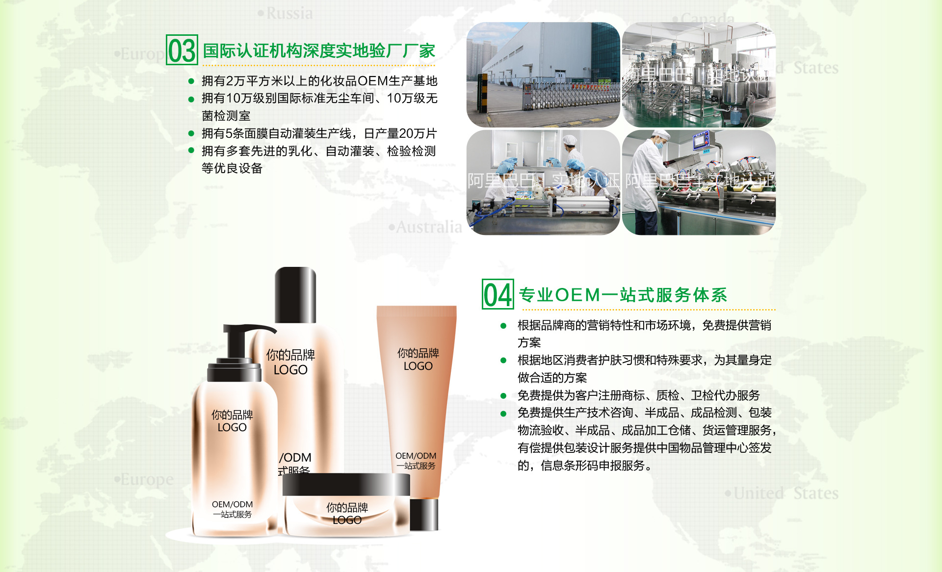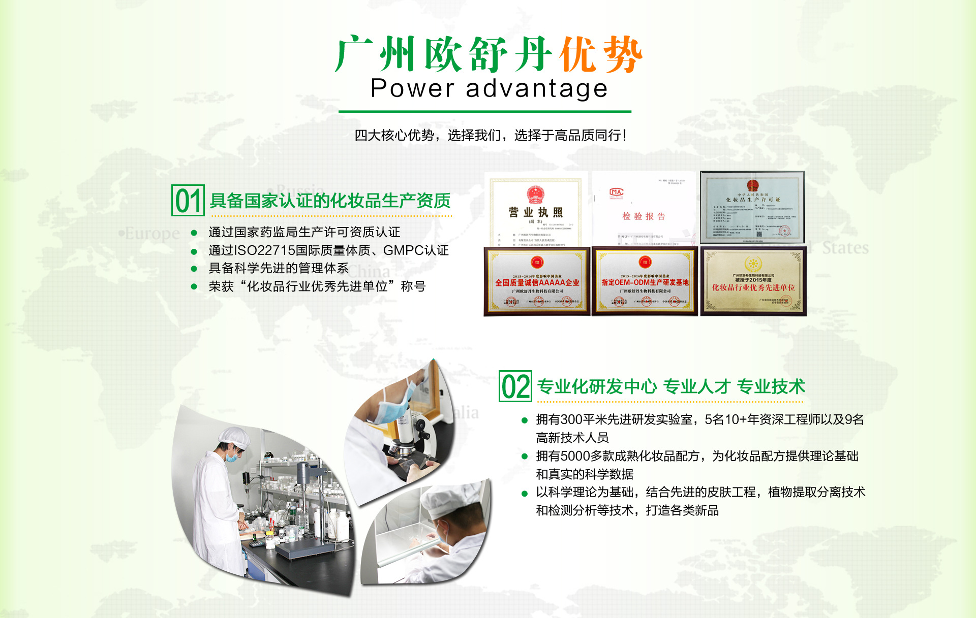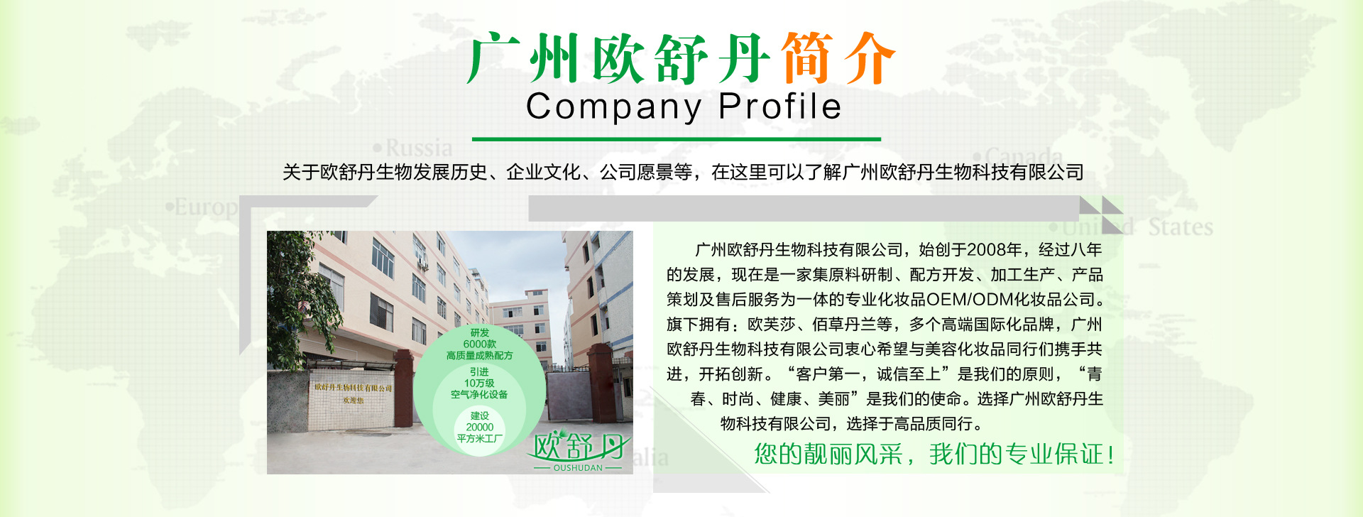 廣州歐舒丹生物科技有限公司是一家技術裝備先進,管理規范到位,環境保護嚴格,生產設備的自動化的加工基地。公司擁有10萬級的空氣凈化車間提供了高清潔的生產環境。配有先進的生產設備和檢測儀器,擁有一批具有多年實踐經驗從事化學工程研究的高級技術人才,開發出上千種高質量的成熟配方,能全面滿足市場的各種需求。 2加工廠優勢:廣州歐舒丹生物科技有限公司是一家集原料研制、配方開發、加工生產、產品策劃及售后服務為一體的專業化妝品OEM/ODM化妝品公司。廣州歐舒丹生物科技有限公司衷心希望與美容化妝品同行們攜手共進,開拓創新。廣州歐舒丹生物科技有限公司本著“客戶第一,誠信至上”的原則,與多個品牌建立了長期的合作關系。熱誠歡迎各界朋友前來參觀、考察、洽談業務。 廣州歐舒丹生物科技有限公司服務項目的優勢:我們擁有專業的研發團隊,國內一流的化妝品生產車間,豐富的OEM代加工經驗,先進的生產檢測設備。