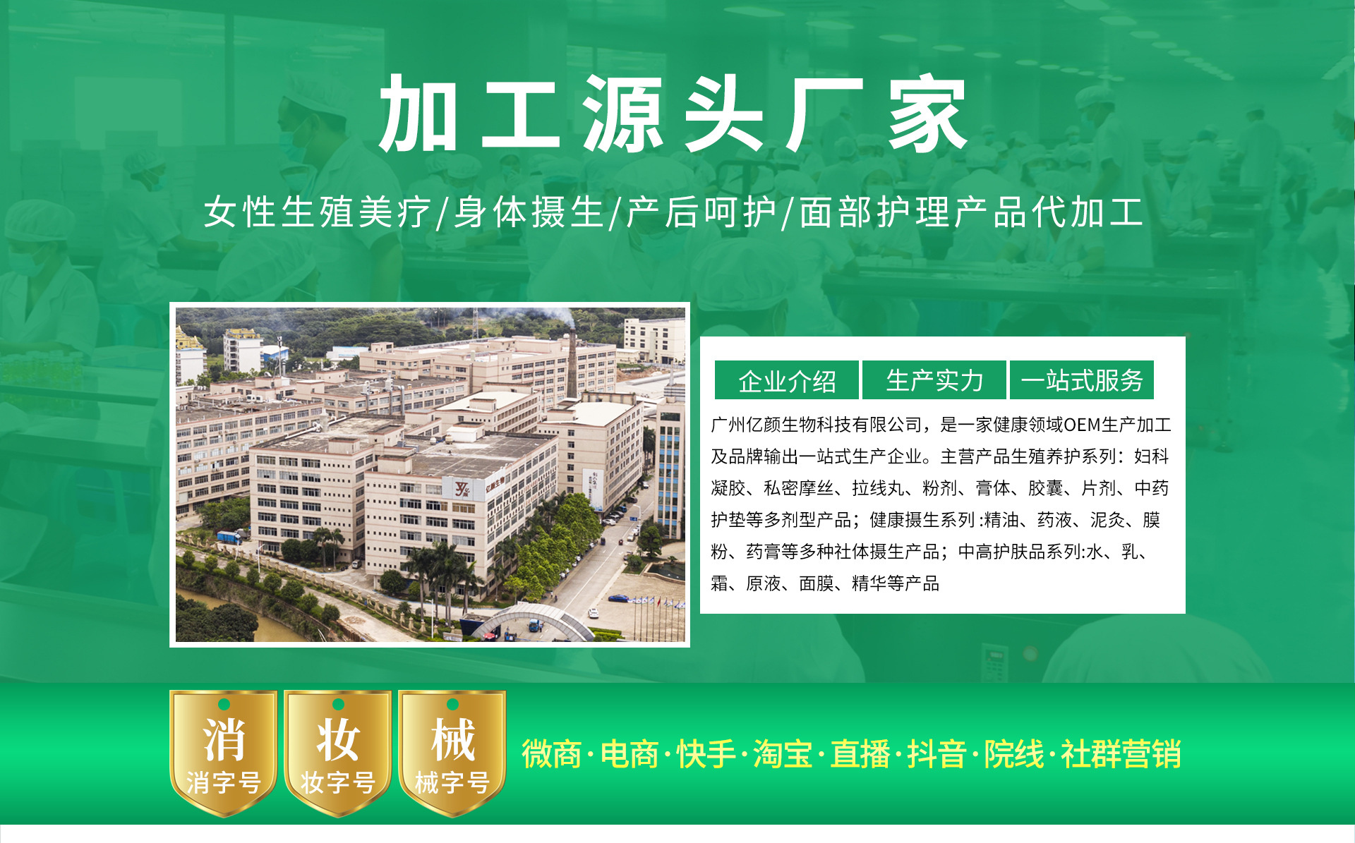 廣州億顏生物科技有限公司現已發展成一家化妝品OEM代加工、范圍包含消妝械字號,是中國美容化妝品業全國質量誠信級企業。公司專業經營:婦科凝膠、膠囊,抑菌拉線片,清宮拉線丸、護墊,碳酸泡泡面膜oem代加工廠家、消字號、化妝品oem代加工、泡泡面膜oem、等產品生產加工,公司實力雄厚,自有4大生產基地、百萬級凈化車間、歐盟GMP標準工廠,為多家品牌提供穩定、可靠的加工定制,成立以來為美容院、微商團隊以及線上線下客戶等提供OEM代加工服務,歡迎廣大客戶咨詢服務。