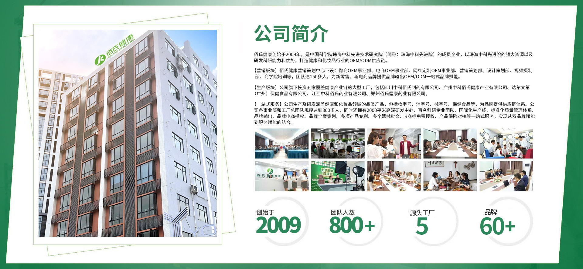 廣東佰氏健康集團成立于2009年,是中國科學院珠海中科院的成員企業,以珠海中科院的強大資源以及研發科研能力和優勢,打造大健康行業的OEM、ODM新標桿。