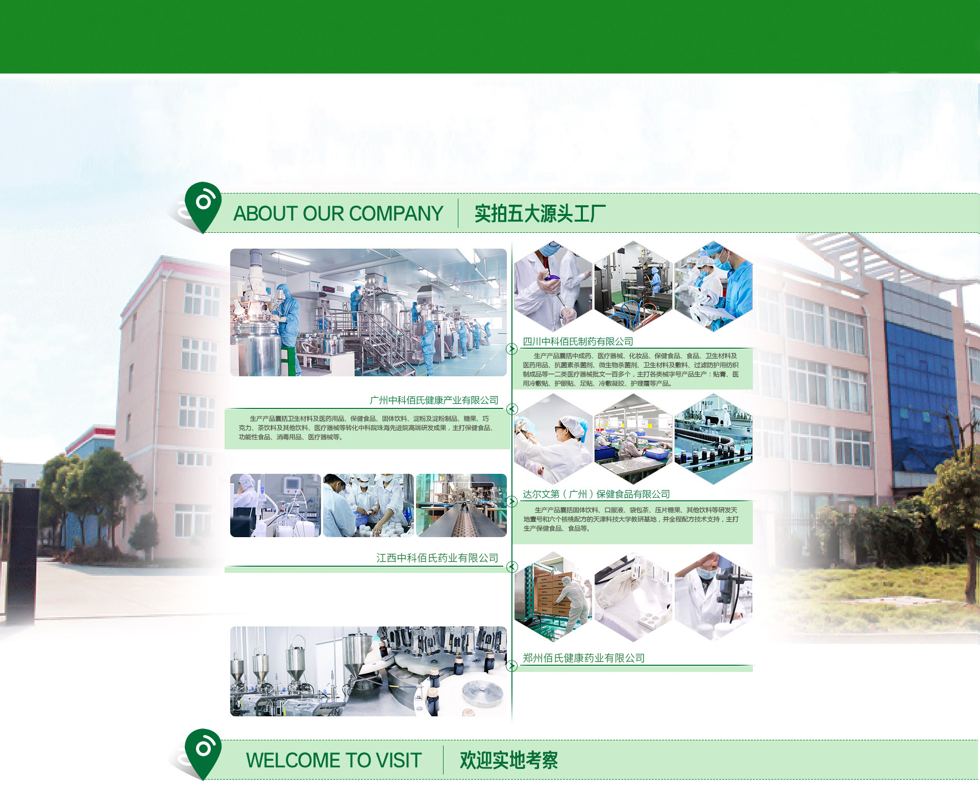 集團旗下擁有四家覆蓋整個大健康產業鏈的大型工廠,包括廣東綠寶堂健康科技有限公司、深圳市佰氏健康藥業有限公司、廣東中科世紀健康科技公司、山西康必健醫療科技股份有限公司,四大生產基地。