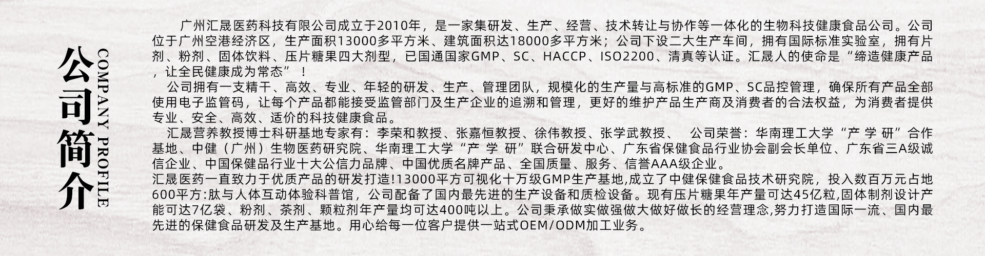 匯晟營養教授博士科研基地專家有:李榮和教授、張嘉恒教授、徐偉教授、張學武教授、 公司榮譽:華南理工大學“產 學 研”合作基地、中健(廣州)生物醫藥研究院、華南理工大學“產 學 研”聯合研發中心、廣東省保健食品行業協會副會長單位、廣東省三A級誠信企業、中國保健品行業十大公信力品牌、中國優質名牌產品、全國質量、服務、信譽AAA級企業。