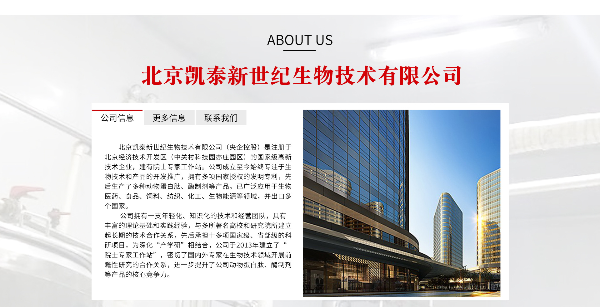 公司簡介 北京凱泰新世紀生物技術(shù)有限公司(央企控股)是注冊于北京經(jīng)濟技術(shù)開發(fā)區(qū)(中關(guān)村科技園亦莊園區(qū))的國家級高新技術(shù)企業(yè),建有院士專家工作站。公司成立至今始終專注于生物技術(shù)和產(chǎn)品的開發(fā)推廣,擁有多項國家授權(quán)的發(fā)明專利,先后生產(chǎn)了多種動物蛋白肽、酶制劑等產(chǎn)品。已廣泛應(yīng)用于生物醫(yī)藥、食品、飼料、紡織、化工、生物能源、環(huán)保等領(lǐng)域,并出口多個國家。 公司擁有一支年輕化、知識化的技術(shù)和經(jīng)營團隊,具有豐富的理論基礎(chǔ)和實踐經(jīng)驗,與多所著名高校和研究院所建立起長期的技術(shù)合作關(guān)系,先后承擔(dān)十多項國家級、省部級的科研項目,為深化“產(chǎn)學(xué)研”相結(jié)合,公司于2013年建立了“院士專家工作站”,密切了國內(nèi)外專家在生物技術(shù)領(lǐng)域開展前瞻性研究的合作關(guān)系,進一步提升了公司動物蛋白肽、酶制劑等產(chǎn)品的核心競爭力。 公司擁有符合GMP要求的標準化廠房,現(xiàn)代化的生物發(fā)酵和提取設(shè)備,國際先進水平的檢測儀器