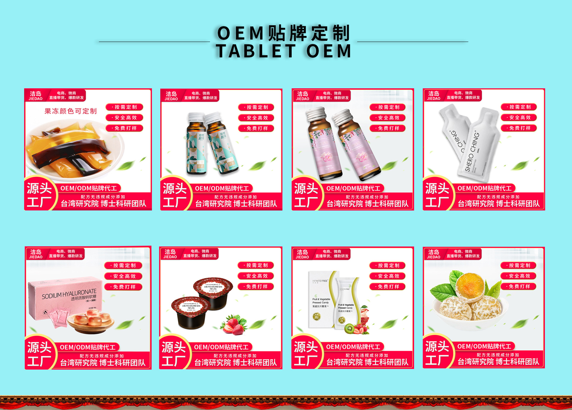 福建省潔島醫療科技有限公司位于福建省泉州市南安市詩山鎮環城路428號,廠區占地面積10000多平,是一家專注于現代生物健康產品,集研發、生產、加工、銷售、服務為一體的綜合性科技企業,擁有獨立的產品研發公司和以臺灣研究院博士為首的強大研發團隊,專業的技術人才,10萬級凈化車間,飲品口服液、固體飲料、壓片果糖、膏滋、粉劑、顆粒劑等多種劑型生產線,并形成了一套完整、科學的質量管理體系。 公司成立以來,秉承“誠信正直,開拓創新,質量過硬,產品優良,成就客戶,合作共贏”的理念,專業高效的OEM的合作模式,受到了業內眾多知名企業的廣泛認可和高度評價。