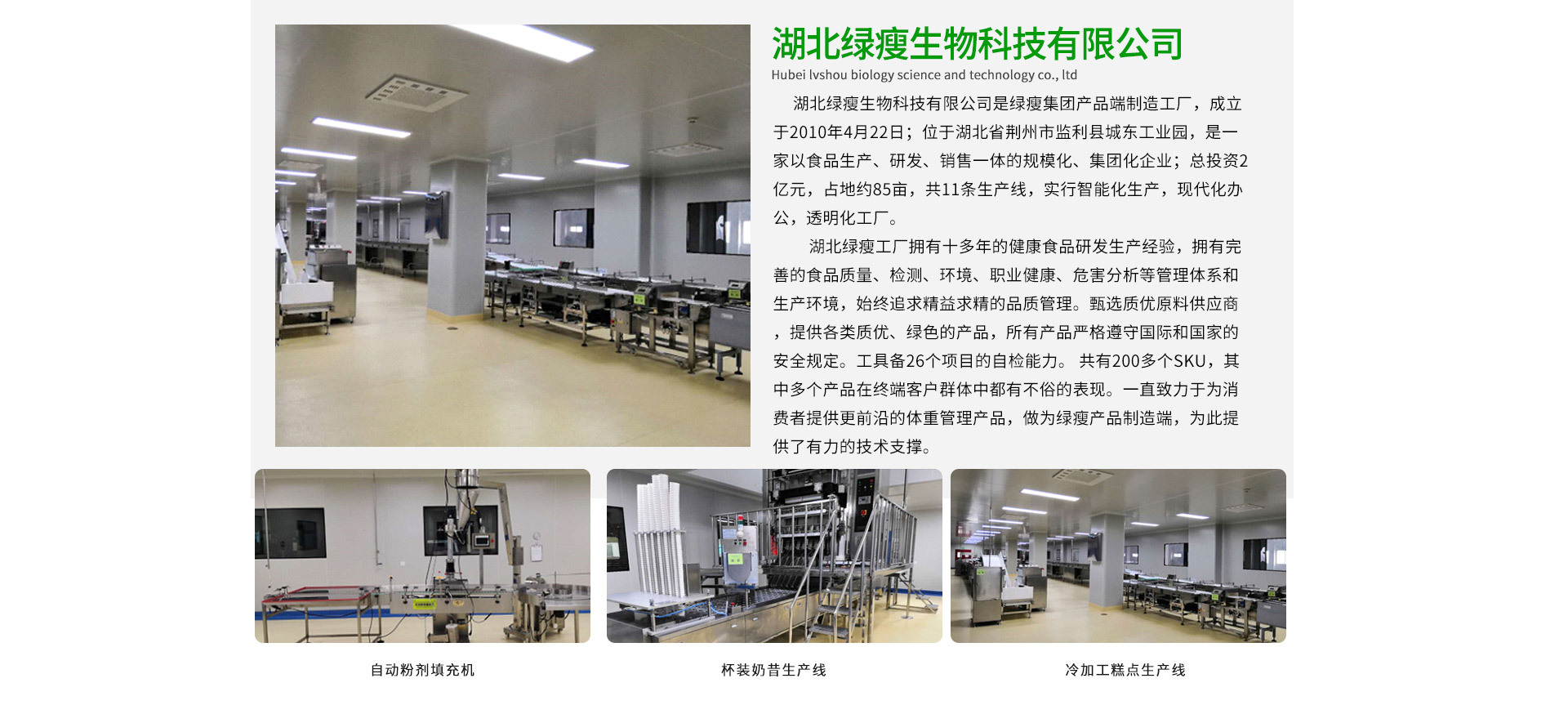 湖北綠瘦生物科技有限公司是代餐粉、代餐奶昔、能量棒、冷糕點等產(chǎn)品專業(yè)生產(chǎn)加工的公司,擁有完整、科學的質(zhì)量管理體系。湖北綠瘦生物科技有限公司的誠信、實力和產(chǎn)品質(zhì)量獲得業(yè)界的認可。歡迎各界朋友蒞臨參觀、指導和業(yè)務(wù)洽談。