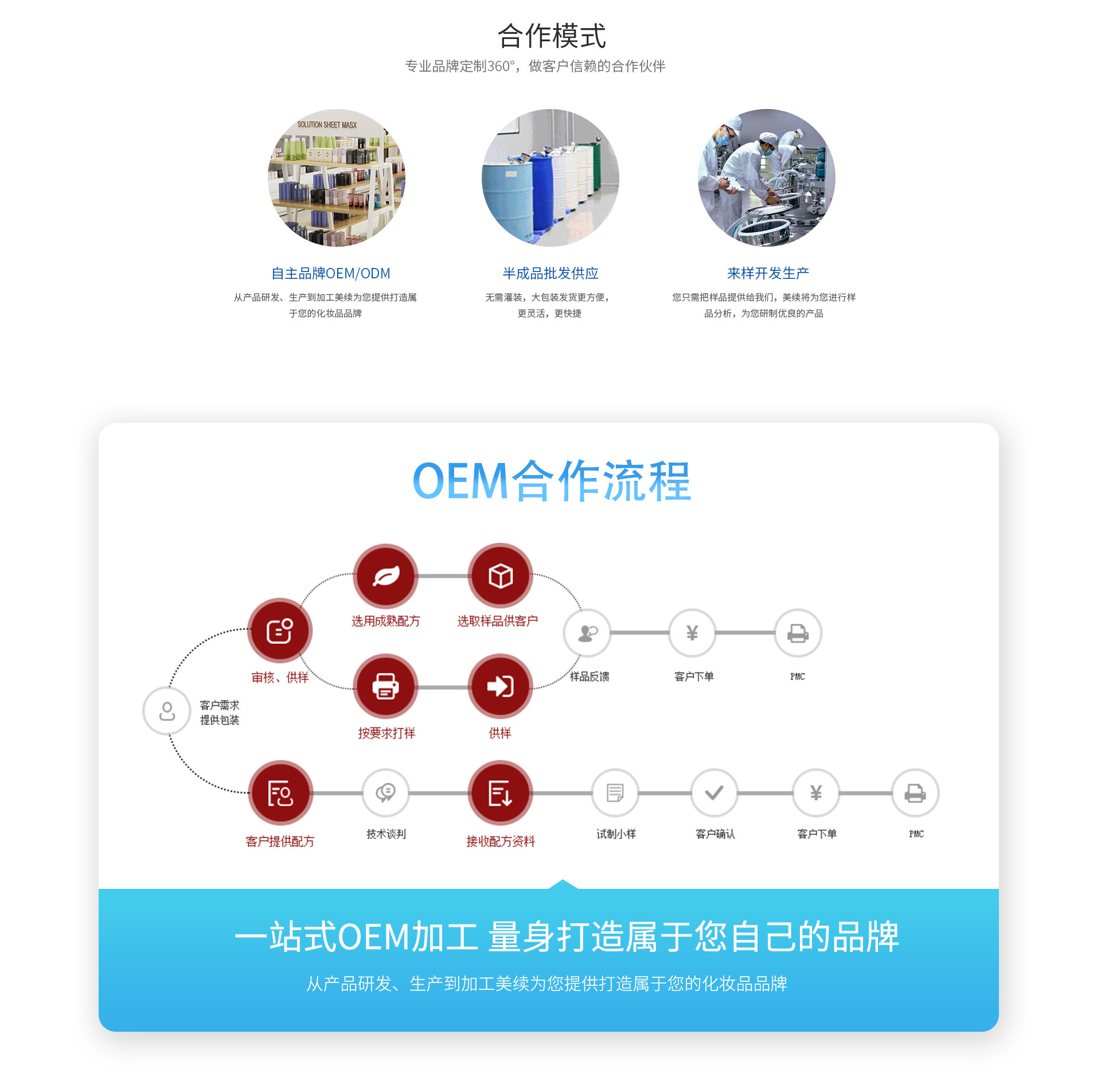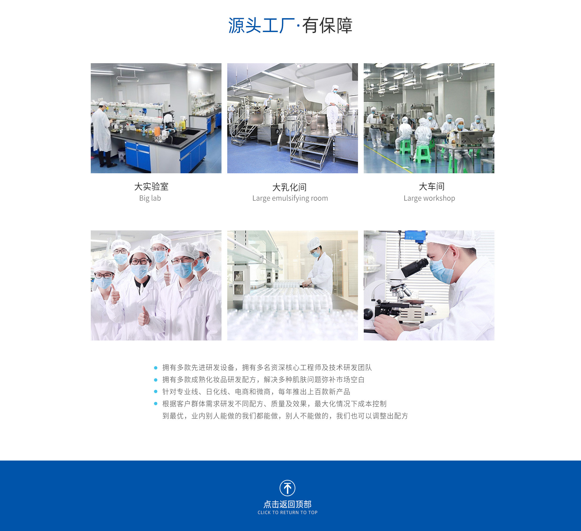 廣州美續化妝品有限公司是一家專業的OEM/ODM護膚產品生產加工的公司,擁有完整、科學的質量管理體系。廣州美續化妝品有限公司的誠信、實力和產品質量獲得業界的認可。歡迎各界朋友蒞臨參觀、指導和業務洽談。我們的企業宗旨:為顧客提供超值的產品和優質的服務我們的企業理念:關心每一位員工的成長,提升每一位員工的價值我們的管理方針:在制度化為原則的基礎上,以人為本充分發揮每個人的潛能,能者上,庸者下,閑者走我們的企業精神。公司一直堅持“ 質量是企業的生命”的指導原則 ,建立有一套完善的從原料、小試、中試、半成品到穩定性、安全性及功效性檢測的質量保證體系。我們產品齊全,質量保證,生產能力強,交貨及時產品性價比高,還可根據客戶的具體要求量身訂造產品。訂貨量不限,依量訂價。公司將一如既往秉承“質量保證,信譽至上”的指導思想,堅持“始終將客戶利益放在首位”、 “ 互利互惠共同發展”的經營宗旨.