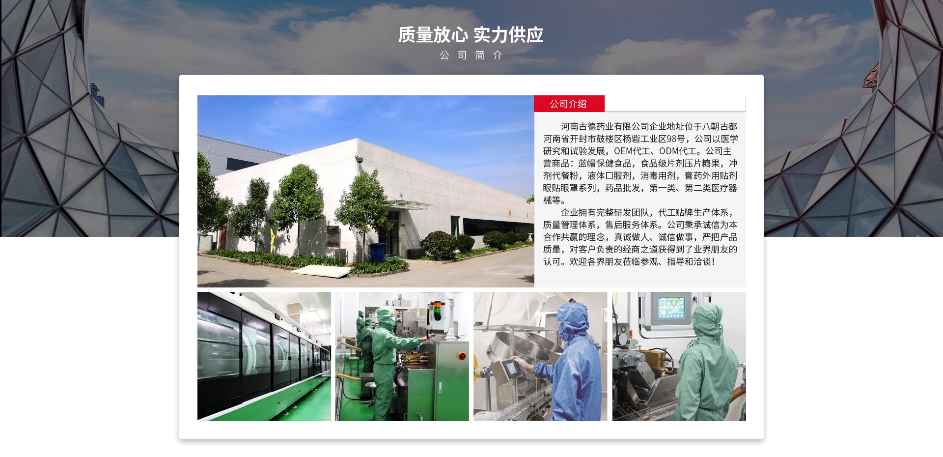 河南古德藥業有限公司企業地址位于八朝古都河南省開封市鼓樓區楊砦工業區98號,公司以醫學研究和試驗發展,OEM代工、0DM代工。公司主營商品:藍帽保健食品,食品級片劑壓片糖果,沖劑代餐粉,液體口服劑,消毒用劑,膏藥外用貼劑眼貼眼罩系列,藥品批發,第一類、第二類醫療器械等。