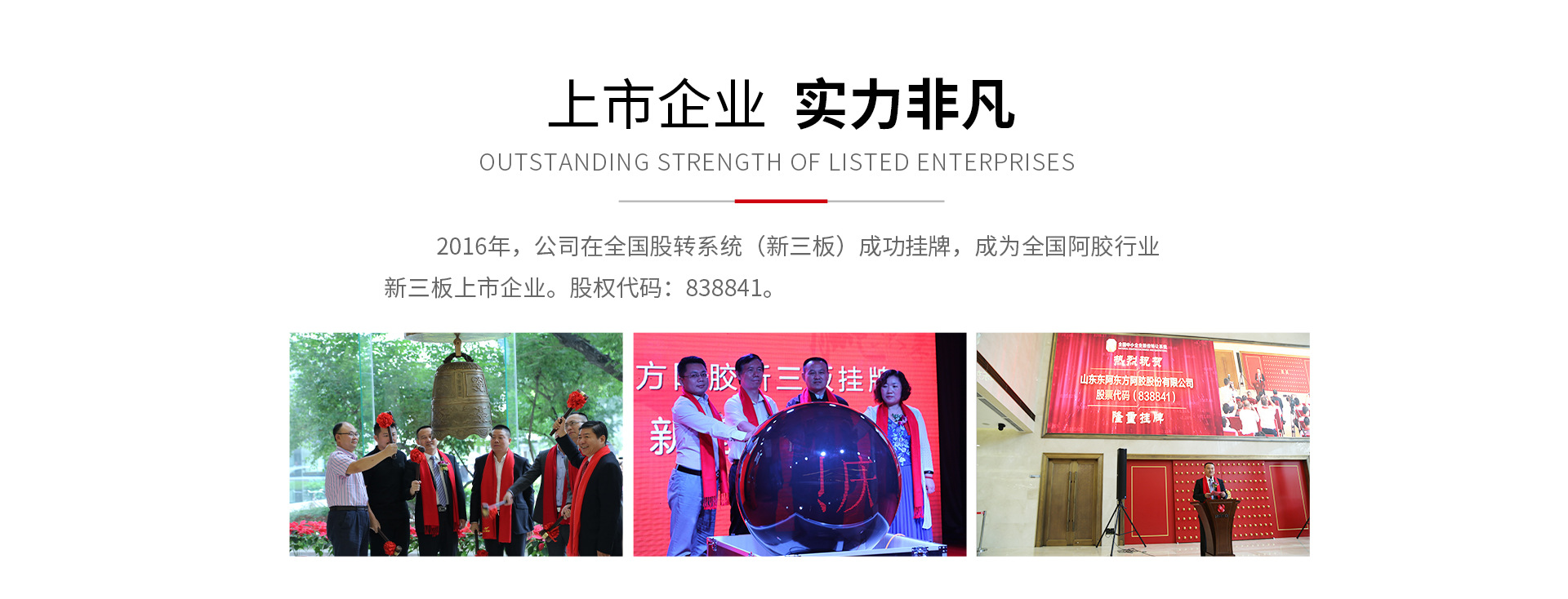 山東東阿東方阿膠股份有限公司于 2002 年成立,坐落于著名的阿膠 之鄉——東阿縣阿膠街 020 號,注冊資金 6000 萬元,占地 100 余畝,現 有員工 300 余人,阿膠及阿膠系列產品年生產能力達 3000 余噸,是一家集生產、研發、銷售、服務為一體的高新技術企業。 公司取得 8 個保健食品文號,6 大項十余種產品的SC 認證許可,獲得20 余項國家專利。是“山東省高新技術企業”,“山東省企業技術中心”和省級“一企一技術”中心科技平臺,“山東省消費者滿意單位”,連續三屆榮獲“山東省名牌產品”、“山東省著名商標”稱號,率先通過了 ISO9001 質量管理體系、22000 食品安全管理體系及HACCP 危害分析與關鍵控制點體系認證,連續數年入圍中國阿膠十大品牌。