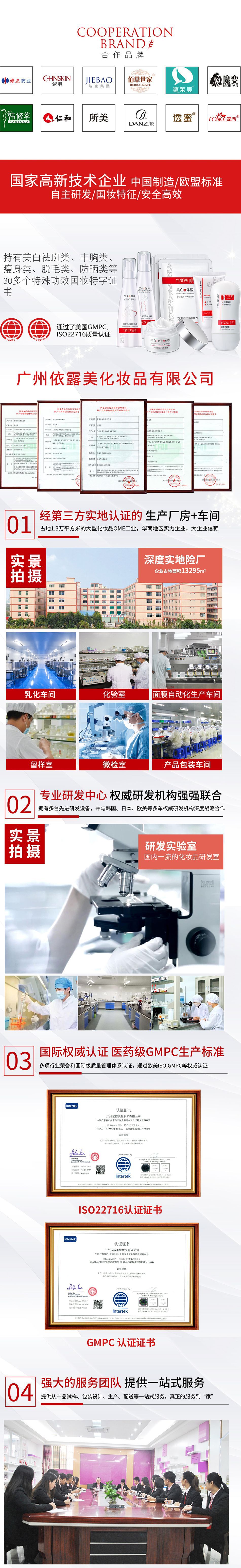 廣州尚美科技有限公司是一家專(zhuān)業(yè)從事全球批發(fā)業(yè)務(wù)的科技型化妝品企業(yè),產(chǎn)品線(xiàn)涉及基礎(chǔ)護(hù)膚和功效化妝品兩大類(lèi)。廣州尚美科技有限公司為廣州依露美化妝品有限公司全球戰(zhàn)略市場(chǎng)合作伙伴之一。 廣州依露美化妝品有限公司坐落于美麗的花城——廣州,地處廣州市白云人和。公司占地面積約10萬(wàn)平方米,員工數(shù)量500余人。集技術(shù)研發(fā)、生產(chǎn)、銷(xiāo)售、OEM/ODM加工定制于一體,將生物技術(shù)、醫(yī)學(xué)技術(shù)、美容科學(xué)、生態(tài)植物科技融合為一,應(yīng)用于健膚美膚、美容化妝、美體護(hù)理等領(lǐng)域。