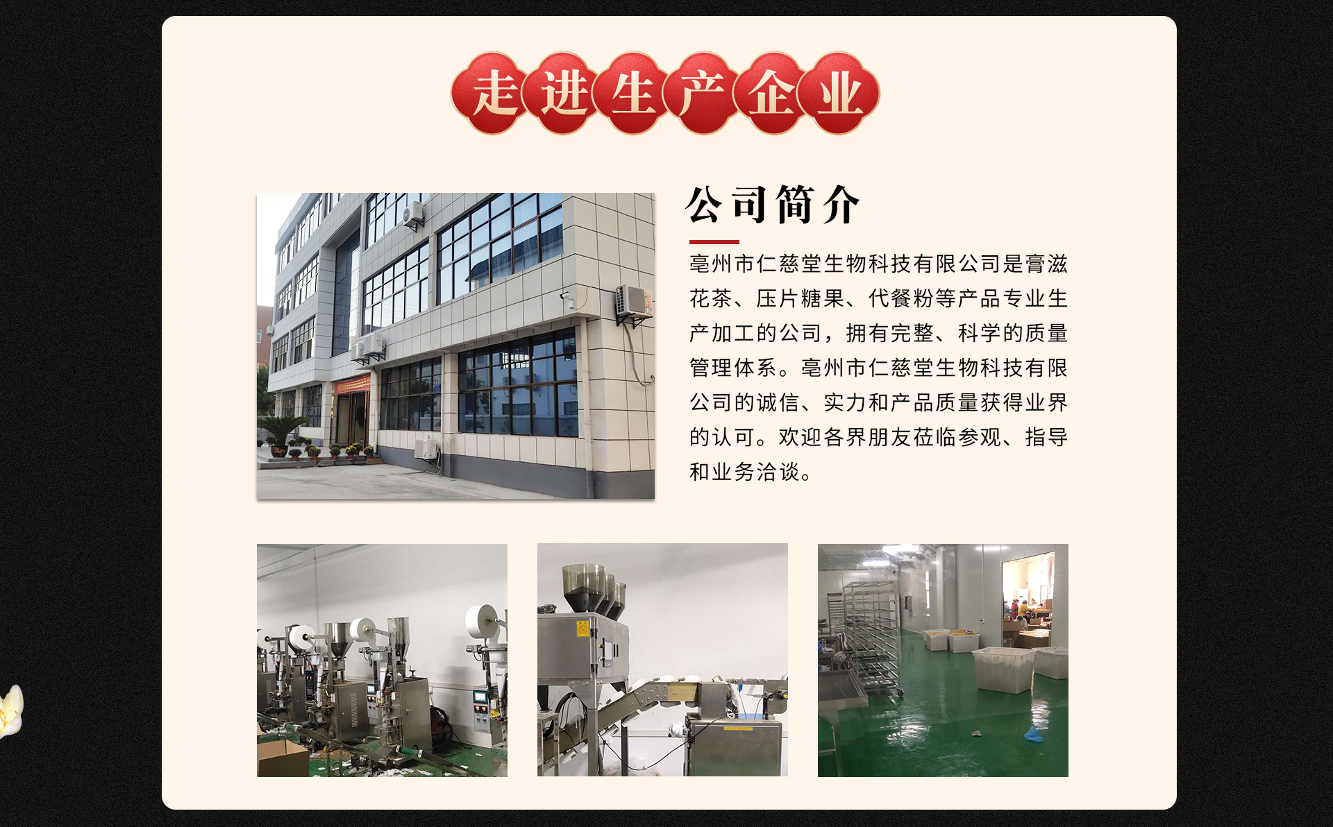 亳州市仁慈堂生物科技有限公司是膏滋、花茶、壓片糖果、代餐粉等產品專業生產加工的公司,擁有完整、科學的質量管理體系。亳州市仁慈堂生物科技有限公司的誠信、實力和產品質量獲得業界的認可。歡迎各界朋友蒞臨參觀、指導和業務洽談。