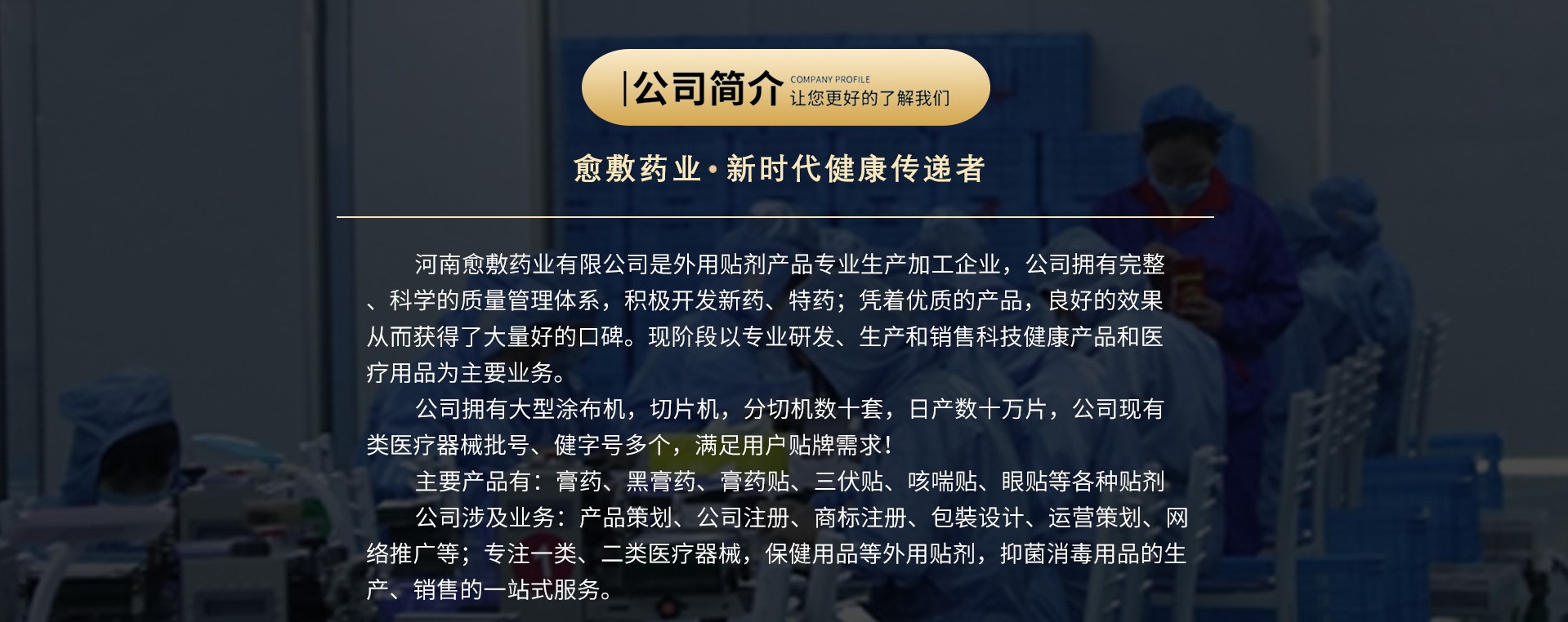 河南愈敷藥業有限公司是外用貼劑產品專業生產加工企業,公司擁有完整、科學的質量管理體系,積極開發新藥、特藥;憑著優質的產品,良好的效果從而獲得了大量好的口碑。現階段以專業研發、生產和銷售科技健康產品和醫療用品為主要業務。