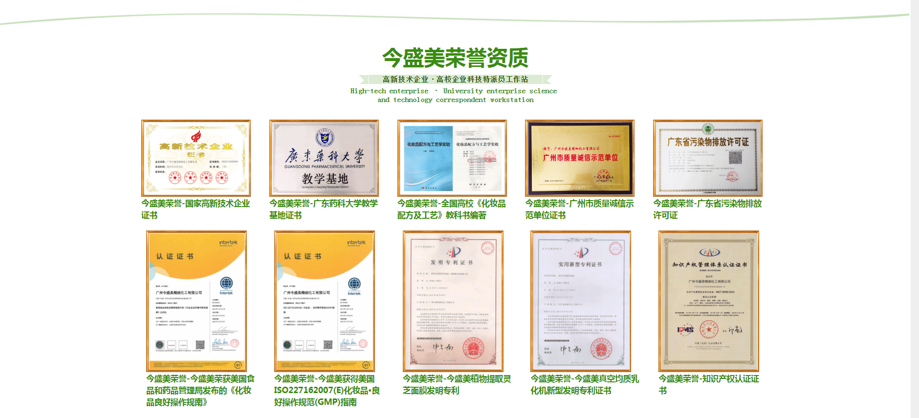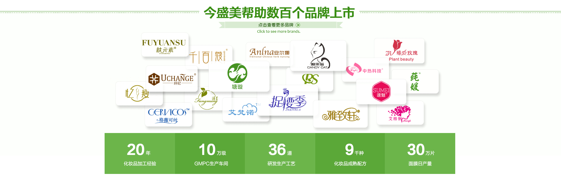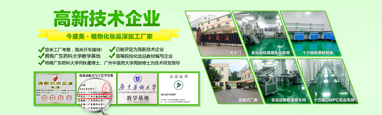 廣州今盛美精細化工有限公司是一家集化妝品研發、生產、銷售、服務于一體的大型化妝品高新技術企業,與廣東藥科大學化妝品研究中心核心成員強強聯手,擁有上萬獨立廠房,研究實驗室,廣藥大檢測研究所,ISO和GMPC雙認證廠房,多臺國際先進的生產及檢驗設備,致力于中國女性肌膚的研究和開發,引入高科技超臨界萃取技術,將天然植物及中草藥有效成分應用于化妝品中,擁有為客戶提供“天然、安全、有效、創新”的綠色化妝品。