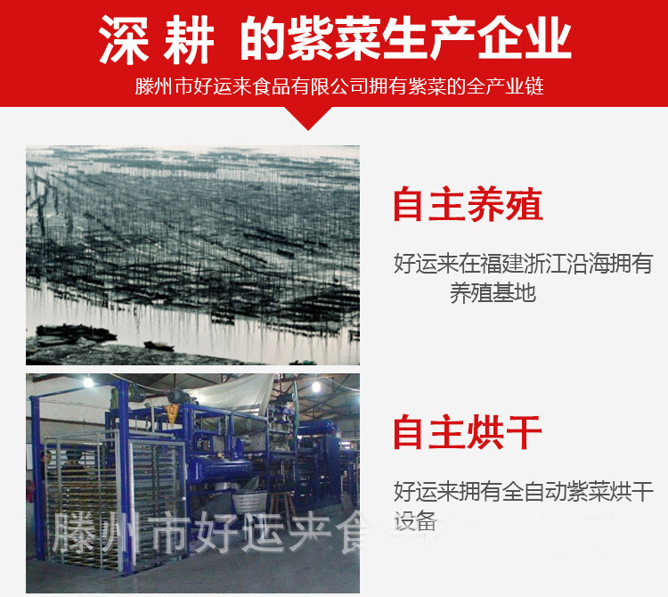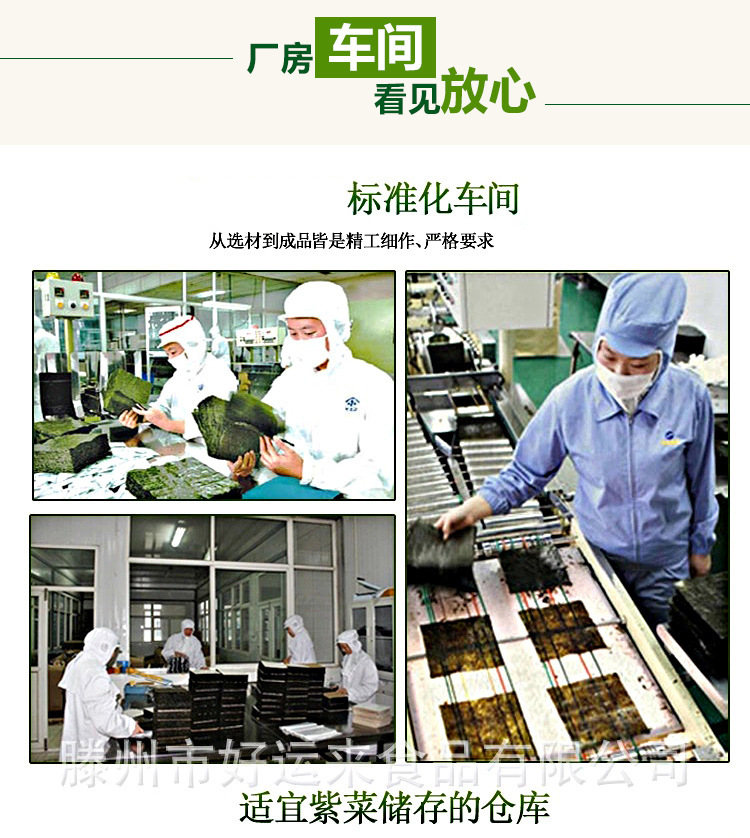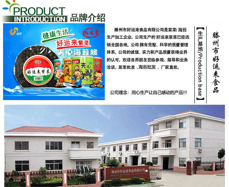 山東滕州市好運來食品有限公司坐落于孔孟之鄉,墨子故里山東滕州市。 滕州市好運來食品有限公司是海苔、紫菜、夾心海苔、炒海苔的生產加工企業。 我公司生產的:海苔卷、肉松海苔、海苔棒、好運來紫菜、臭狗熊海苔、苔之戀海苔、譽貢紫菜、紹龍紫菜,已經遠銷全國30個省和自治區,在線上電商和線下商超均有銷售。 公司生產加工的產品有: 夾心海苔、海苔、壽司海苔、海苔卷、海苔棒、肉松海苔、調味海苔、紫菜、壇紫菜、海苔 、炒紫菜、 炒海苔等。