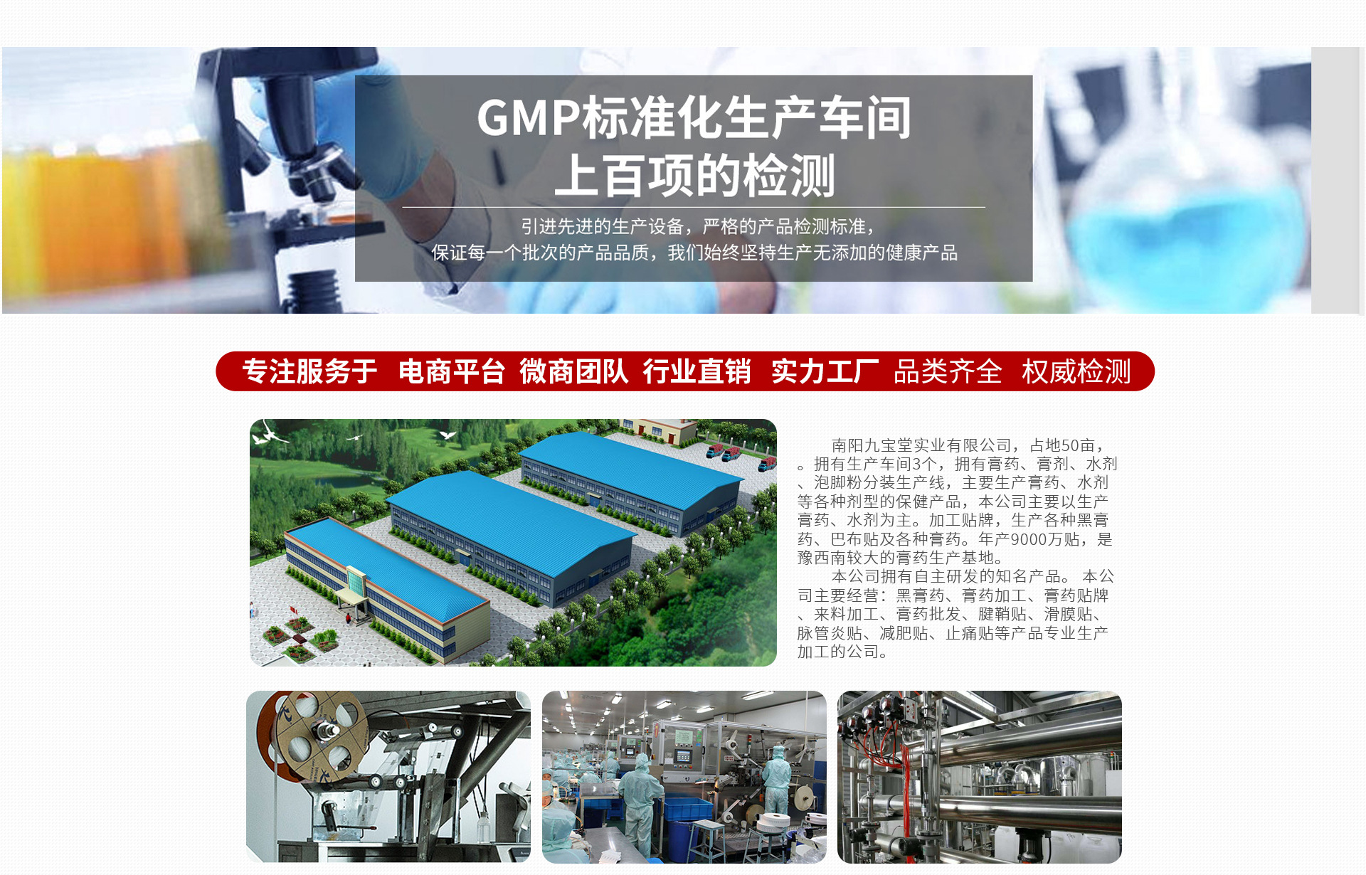 南陽九寶堂實業(yè)有限公司是膏藥、膏貼、黑膏藥、中草藥貼、巴布貼、無紡布貼、肚臍貼、水劑、膏劑、護理凝膠、膝蓋貼、減肥貼、腳氣噴劑、膏藥加工、膏藥貼牌、腱鞘貼、止痛貼、脈管炎帖、靜脈曲張膏、乳腺貼等產品專業(yè)生產加工的公司,擁有完整、科學的質量管理體系。主要生產膏藥、水劑等各種劑型的保健產品。 本公司主要以生產膏藥、水劑為主。加工貼牌,生產各種黑膏藥、巴布貼及各種膏藥。年產9000萬貼,是豫西南較大的膏藥生產基地。 南陽九寶堂實業(yè)有限公司的誠信、實力和產品質量獲得業(yè)界的認可。歡迎各界朋友蒞臨參觀、指導和業(yè)務洽談。