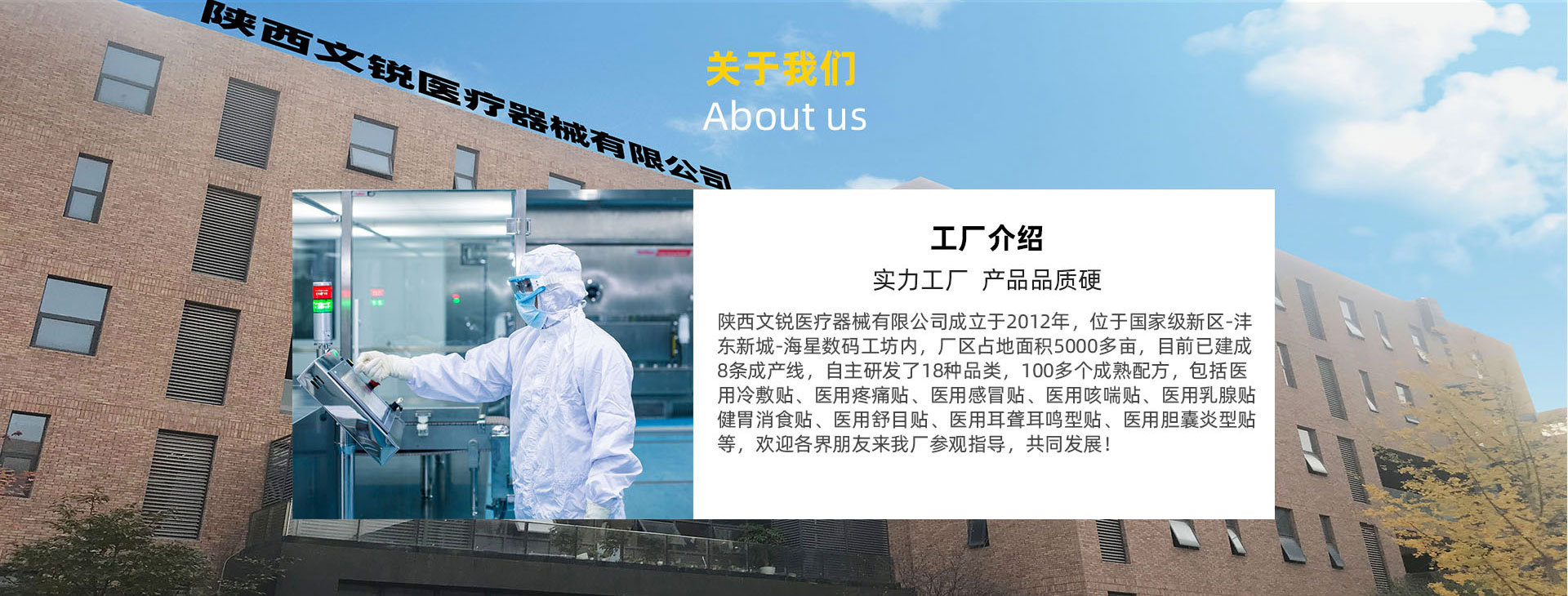 陜西文銳醫療器械有限公司成立于2012年,位于國家級新區 灃東西城-海星數碼工坊內,廠區占地面積5000多畝,目前已建成8條生產線,自主研發了18種品類,包括醫用冷敷貼、醫用疼痛貼、醫用感冒貼、醫用咳喘貼、醫用乳腺貼、健胃消食貼等100多個成熟配方產品,文銳歡迎各界朋友來我廠參觀指導,共同發展!