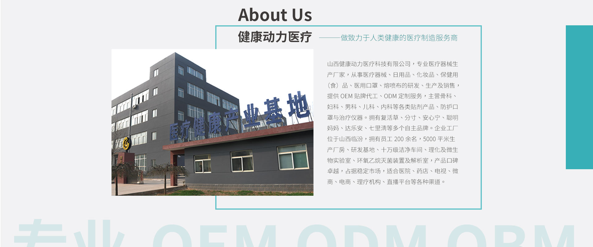 山西健康動力醫療科技有限公司,專業醫療器械生產廠家,從事醫療器械、日用品、化妝品、保健用(食)品、醫用口罩、熔噴布的研發、生產及銷售,提供 OEM 貼牌代工、ODM 定制服務,主營骨科、婦科、男科、兒科、內科等各類貼劑產品、防護口罩與治療儀器。擁有復活草、分寸、安心寧、聰明媽媽、達樂安、七里淸等多個自主品牌