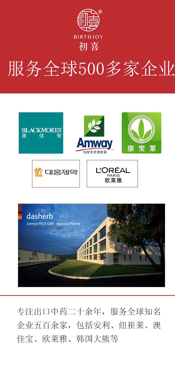 初喜專注出口中藥二十余年,服務全球知名企業五百余家,包括安利、紐崔萊、澳佳寶、歐萊雅、韓國大熊等。